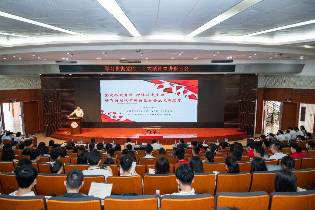为推动深入学习贯彻党的二十大精神,把全校师生员工的思想和行动统一到党的二十大精神上来,11月20日上午,校党委学习贯彻党的二十大精神宣讲报告会暨党校名家讲坛在思明校区经济楼N402报告厅举行,校党委副书记、马克思主义学院院长、学习贯彻党的二十大精神省委宣讲团成员徐进功作宣讲报告。报告会以线上线下相结合的方式进行,在翔安校区、漳州校区设分会场,校关工委常务副主任赖虹凯,学生工作部、校团委相关负责人,马研班、思源计划、行远计划、石榴籽班、骨干班全体师生学员400余人参加。报告会由李峰主持。