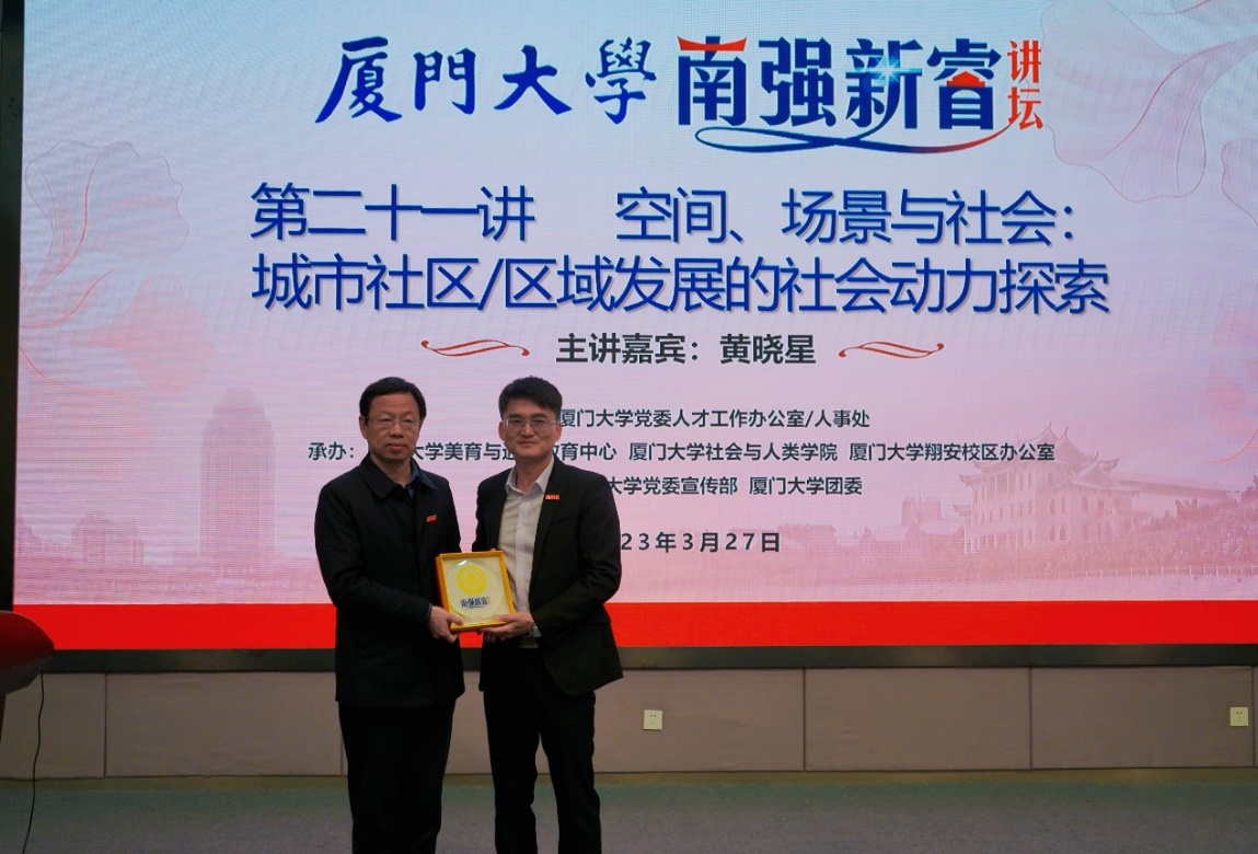 3月27日晚,厦门大学南强新睿讲坛第二十一讲在翔安校区德旺图书馆2号报告厅举行。社会与人类学院教授黄晓星作题为“空间、场景与社会:城市社区/区域发展的社会动力探索”的专题讲座。厦门大学党委人才工作办公室/人事处、美育与通识教育中心、社会与人类学院负责人和有关人员出席本次讲坛。