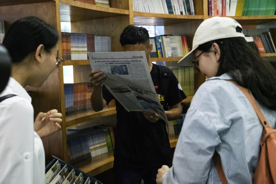 德宏传媒集团旗下的德宏民族出版社为实施中华文化“走出去”、解决边境两侧群众“看书难、买书难、借书难”的问题、满足边境各族群众不断增长的精神文化需求,在州委州政府的指导带领下,于2009年9月起先后建立了7个国门书社。7月11号,实践队成员分别参观了瑞丽姐告国门书社和银井“一寨两国”国门书社。这里摆放着各类翻译成缅文的书籍、胞波报、团结报等,很多来华务工的缅籍人员会在这里阅读学习,了解中国文化。同时,他们还可以在这些报纸上看到最新的对缅政策、务工信息、跨国婚姻登记办理指南、缅籍人员如何就医等极具实用性的内容。