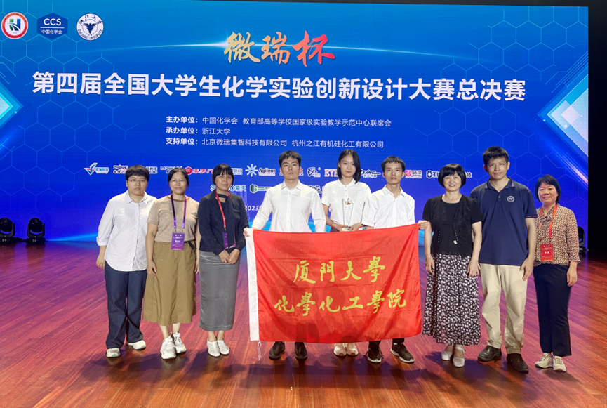 近日,由中国化学会和教育部高等学校国家级实验教学示范中心联席会主办,浙江大学承办的“微瑞杯”第四届全国大学生化学实验创新设计大赛总决赛在浙江杭州举行。由我校化学化工学院本科生齐彤旭、刘佳瑶、苏丕君三人组成的厦门大学代表队(指导教师:赵海霞、任艳平)在大赛中表现出色,荣获总决赛特等奖。
