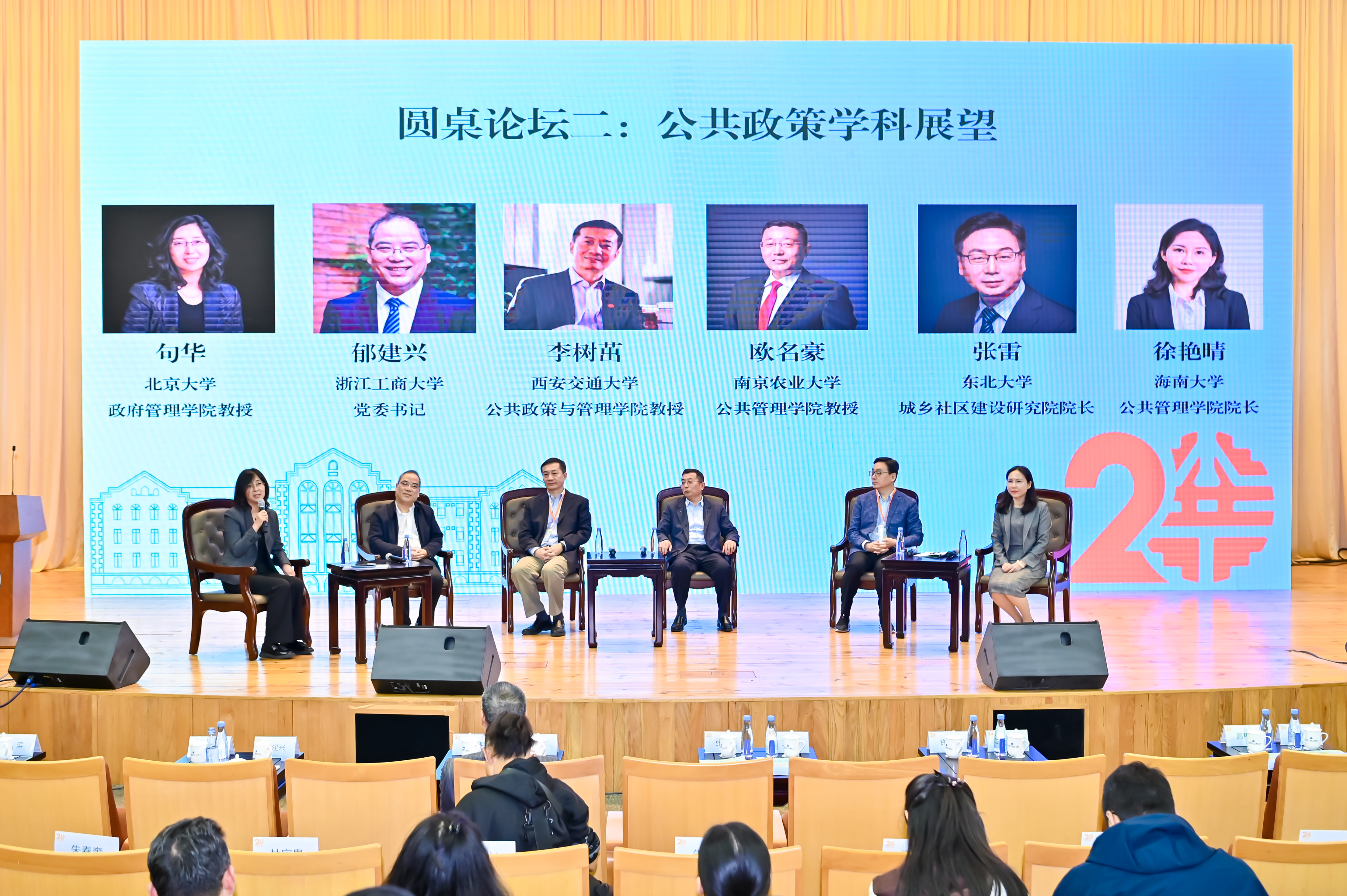 本次会议还开展了两场圆桌论坛。华中科技大学副校长许晓东教授,中山大学社会科学部主任、政治与公共事务管理学院肖滨教授,上海交通大学国际与公共事务学院院长吴建南教授,教育部中学校长培训中心副主任、华东师范大学教育学部郅庭瑾教授以及华中师范大学公共管理学院院长徐增阳教授围绕“交叉学科视野下的公共政策”开展了第一场圆桌论坛讨论。论坛由中国人民大学交叉科学研究院院长杨开峰教授主持。教育部高等学校公共管理类专业教学指导委员会秘书长、浙江工商大学党委书记郁建兴教授,西安交通大学公共政策与管理学院李树茁教授,南京农业大学公共管理学院欧名豪教授、东北大学城乡社区建设研究院院长张雷教授、以及海南大学公共管理学院院长徐艳晴教授围绕“公共政策学科展望”主题开展了第二场圆桌论坛交流。论坛由北京大学政府管理学院句华教授主持。