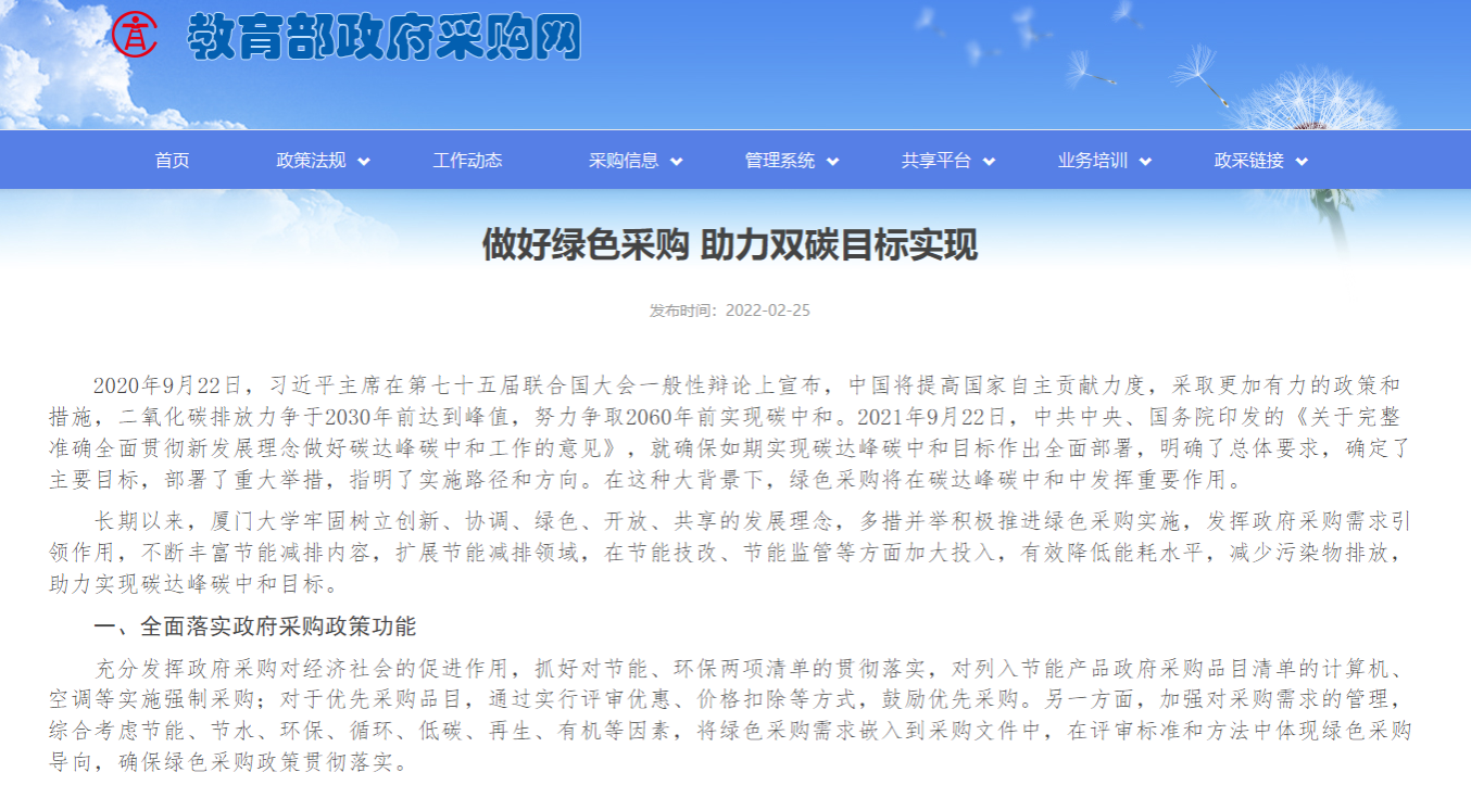 文章介绍,厦门大学贯彻新发展理念,围绕实现“双碳”目标,从落实政府采购政策功能、服务基础理论和方法研究、实施“互联网+政府采购”、提升能耗管理水平、强化节水护水力度、推进资源循环利用、推广合同能源管理、应用新产品新技术等方面,多措并举积极推进绿色采购实施。