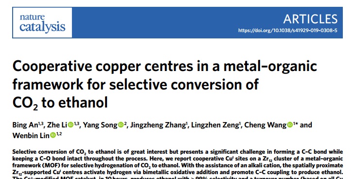 化学化工学院汪骋教授课题组在MOF负载的Cu基催化剂用于CO2氢化方面取得进展。相关研究成果“Cooperative copper centres in a metal–organic framework for selective conversion of CO2 to ethanol”在线发表于Nature子刊《自然-催化》(Nature Catalysis, DOI:10.1038/s41929-019-0308-5)。