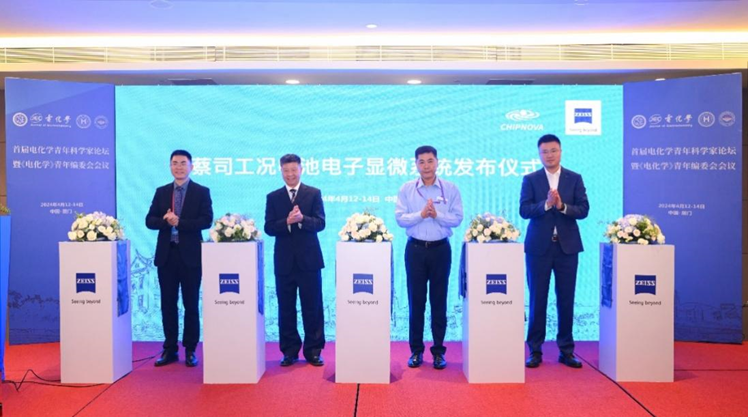 会上举行电化学全新方案——“工况液体电化学电子显微系统”发布仪式。孙世刚、张育薪、廖洪钢和蔡司显微镜事业部材料科研负责人黄铭刚共同为方案发布剪彩。该方案由厦门大学团队、蔡司集团、厦门超新芯科技有限公司合作推出,是首个具有纳米级分辨率的原位工况液体电化学解决方案。方案聚焦电化学与新兴的高时空分辨原位技术的结合,依靠独特的结构设计,可在扫描电镜中实现工况条件下液体电解质电池的实时动态高分辨成像和多模态分析,为中国本土科技创新与国际科研产业融合增添新案例。