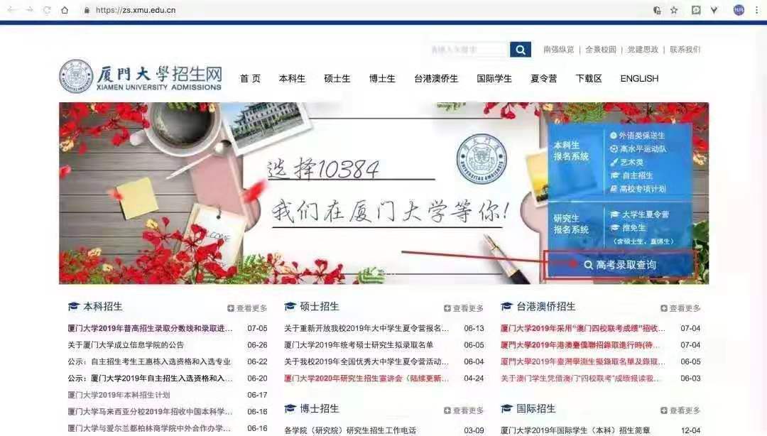 考生可通过https://zs.xmu.edu.cn/访问厦门大学招生网。在“首页”点击“高考录取查询”,跳转到录取结果查询页面。