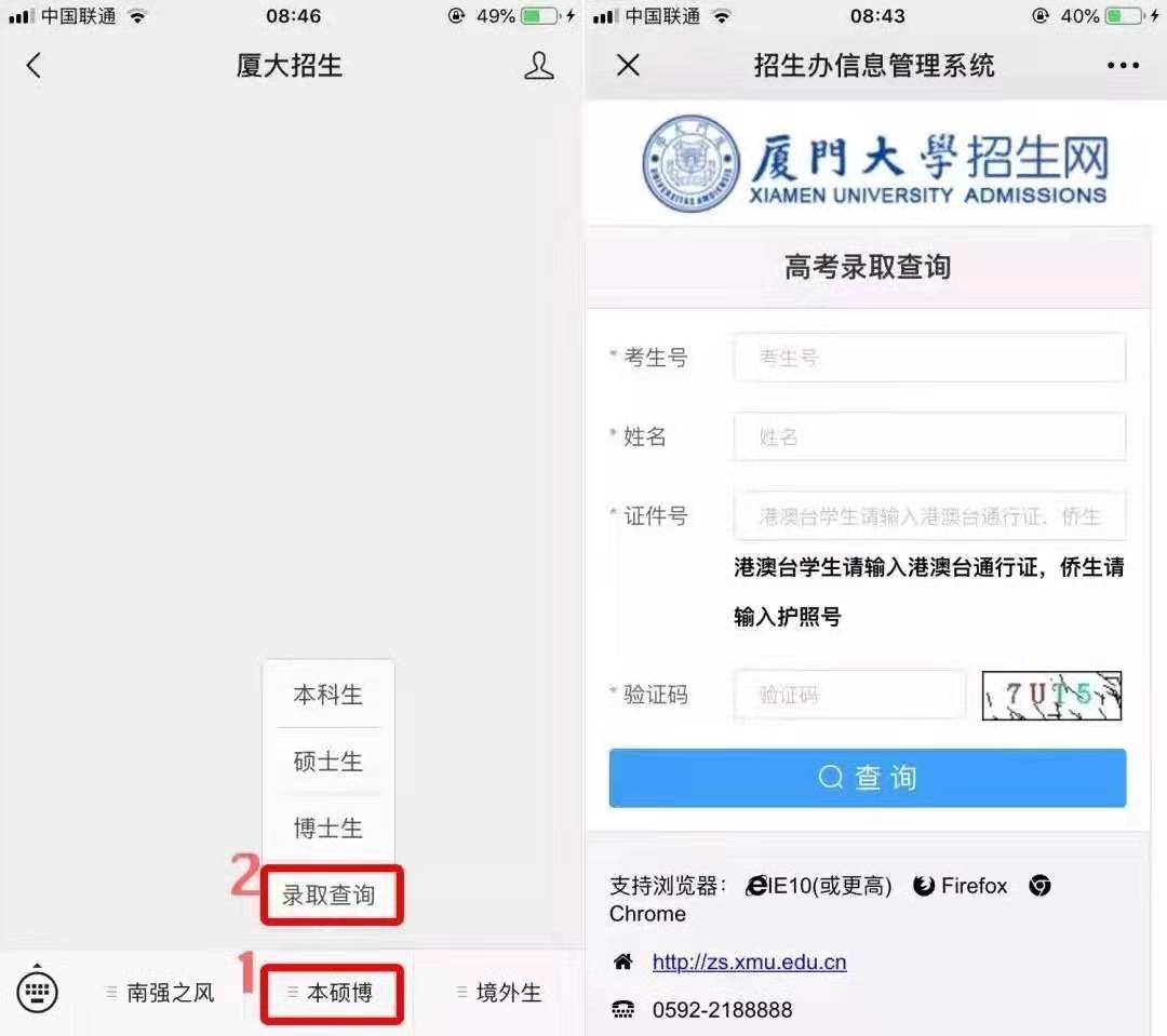 考生还可以关注“厦大招生”微信公众号,选择“本硕博”栏目下面的“录取查询”,跳转到录取结果查询页面。