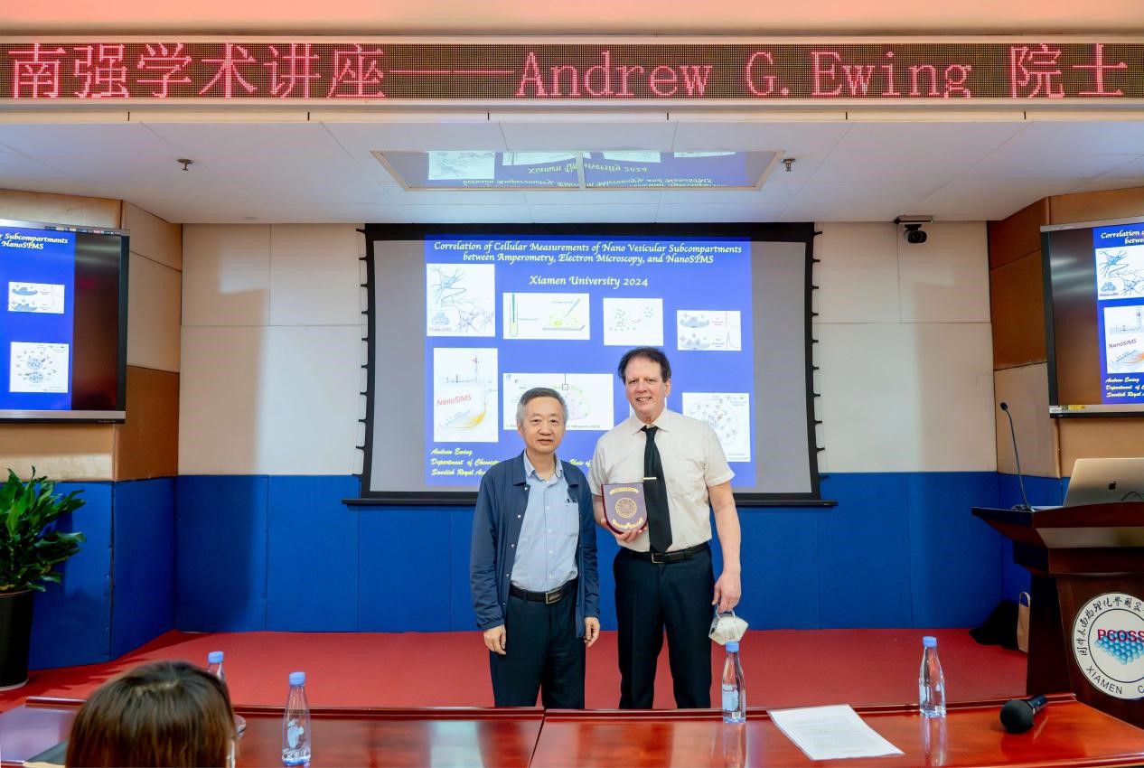 4月15日,瑞典皇家科学院院士、哥德堡皇家艺术与科学院院士安德鲁·尤因(Andrew G.Ewing)做客厦门大学“南强学术讲座”,作题为《Correlation of Cellular Measurements of Partial Exocytosis and Nano Vesicular Subcompartments between Amperometry and NanoSIMS》的精彩报告。中国科学院院士田中群主持讲座并为安德鲁·尤因颁发“南强学术讲座”荣誉铭牌。