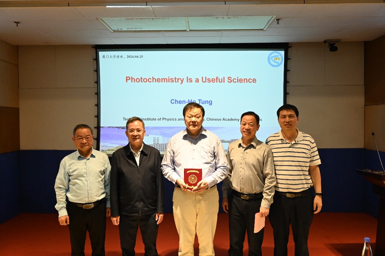 4月25日,中国科学院院士、中国科学院理化技术研究所研究员佟振合作客厦门大学最高层次学术讲座——“南强学术讲座”,作题为“光化学是一门有用的学科”的精彩报告。中国科学院院士、我校化学化工学院谢素原教授,研究生院常务副院长、化学化工学院谢兆雄教授,化学化工学院院长任斌教授等出席讲座。讲座开始前,谢素原为佟振合颁发“南强学术讲座”荣誉铭牌。讲座由任斌主持。