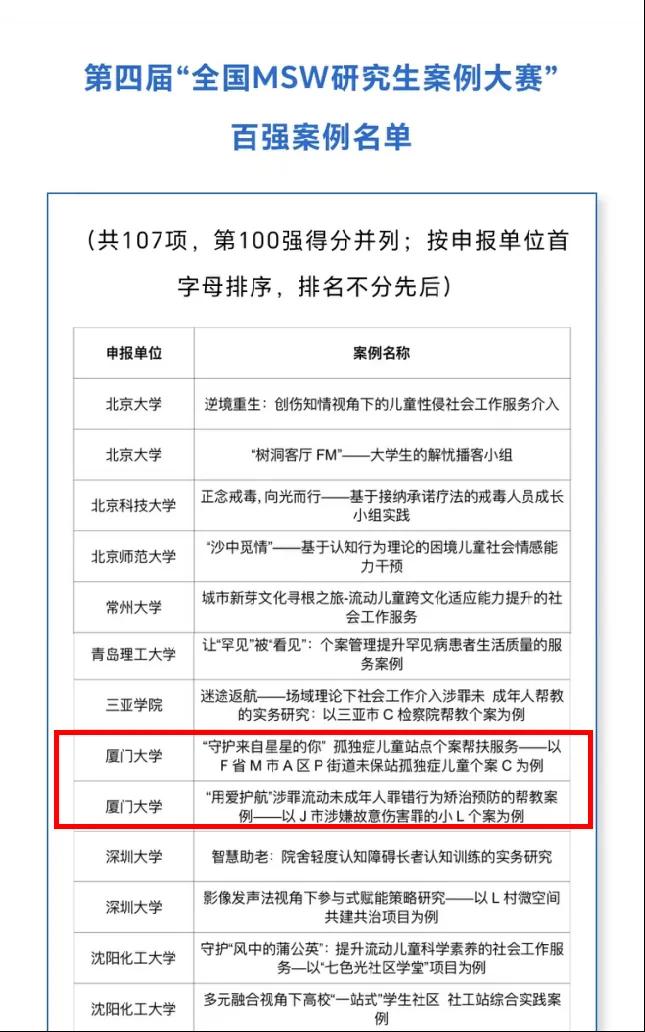 据悉,全国MSW研究生案例大赛是由社会工作专业学位研究生教育指导委员会指导、社会工作专业学位研究生教育院校联席会议主办的全国相关领域最高水平的赛事之一。本届赛事中,来自北京大学、中国人民大学、复旦大学、厦门大学、西安交通大学等全国168所MSW研究生培养单位的422篇参赛案例进入初赛通讯评审。经过匿名评审,评选出百强案例。前四十强案例受邀进入决赛,通过案例展示和现场答辩确定最终排名。