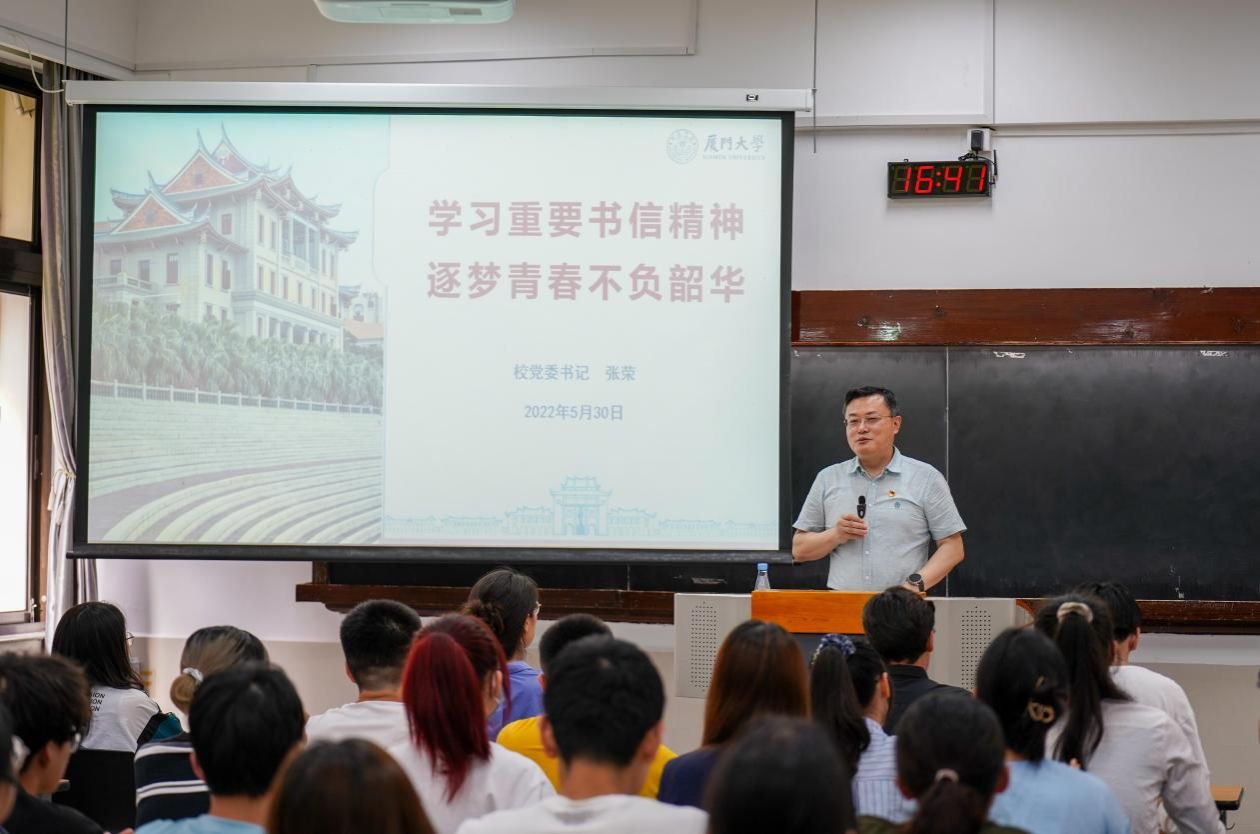 张荣以亲身经历过的3封书信:习近平总书记致第二十二届国际历史科学大会的贺信、给厦门大学外籍教授潘维廉的回信、致厦门大学建校100周年的贺信为切入点,结合当前国际国内形势、党和国家的大政方针,详细讲述了书信背后的故事,启示同学们要在新环境和新形势下,重视历史、研究历史、借鉴历史,坚定历史自信、把握历史主动;要坚定文化自信,站稳中华文化立场,学会以讲好个人“小故事”来展示国家的“大形象”;要努力成长为德智体美劳全面发展,具有引领性、人文性、时代性、开放性特征的新时代领军人才。