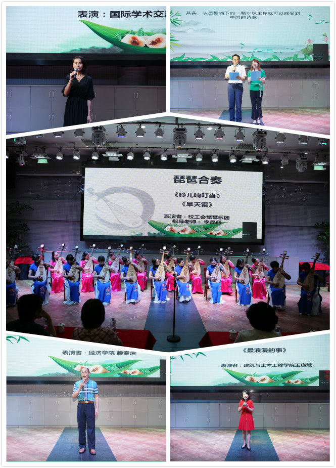 教职工琵琶乐团悠扬的琵琶合奏拉开了活动序幕,来自基层部门工会的王瑛慧、潘宁、侯振清、赖春燎、吴小昕等老师分别用歌曲和诗词朗诵等艺术形式,表达对祖国深深的爱与敬意,对美好生活的向往和追求。之后,大家在后勤饮食服务中心师傅的指导下,折粽叶、装糯米、放馅料、裹扎绳,一片片翠绿的苇叶,在灵巧的手指间游走,一团团晶莹的糯米,氤氲着浓浓的粽香。在活动过程中,还穿插了端午趣味问题抢答环节,向大家宣传端午节的由来和丰富的文化内涵,喜悦洋溢在教职工们的脸上。