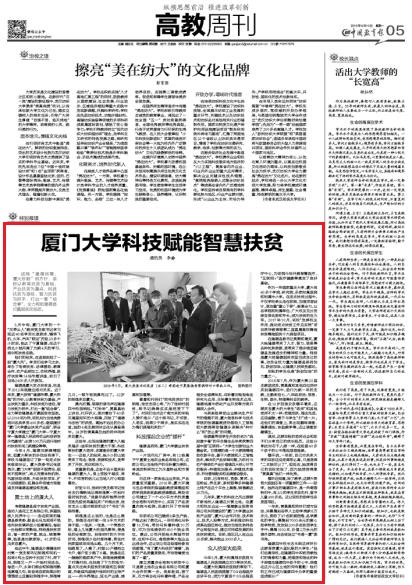 6月10日,《中国教育报》第5版以“厦门大学科技赋能智慧扶贫”为题,大半个版面报道我校充分发挥自身优势,全力帮助宁夏隆德打赢脱贫攻坚战的做法和成效。
