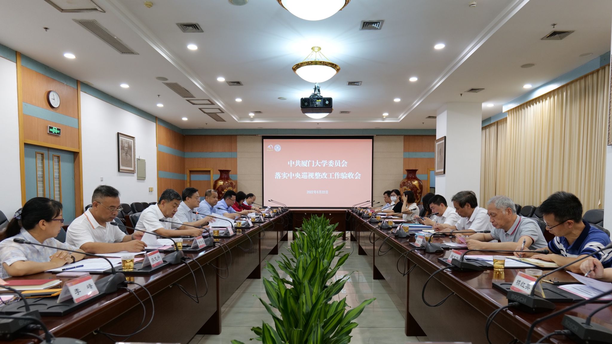 6月22日上午,学校党委在颂恩楼215会议室召开落实中央巡视整改工作验收会。校党委书记张荣,校党委常务副书记林东伟,校党委副书记、纪委书记、国家监委驻厦门大学监察专员全海,校党委常委、组织部部长孙理出席会议。相关责任单位主要负责人和巡视整改办有关人员参加会议。会议由全海主持。