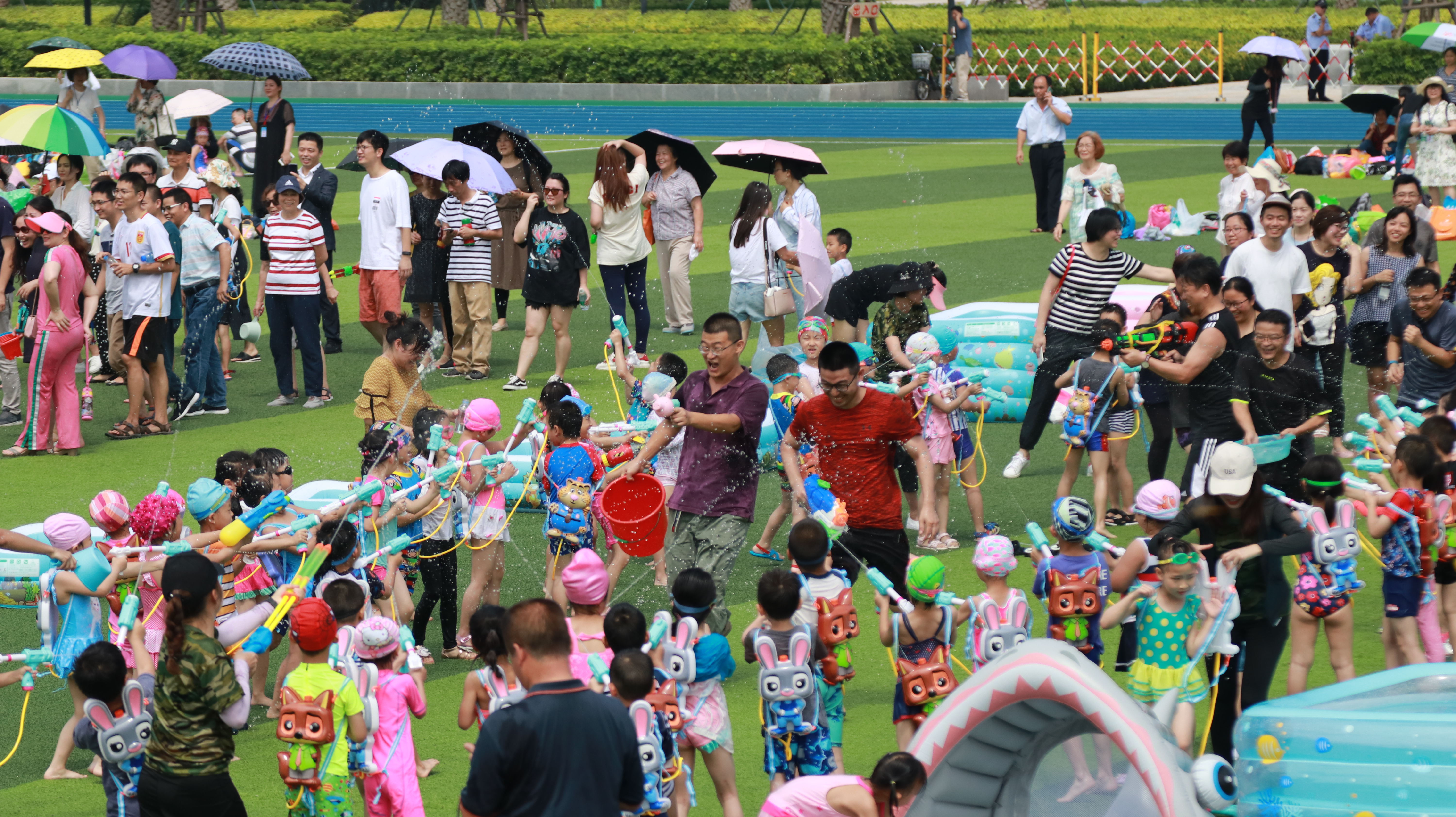 在演武场上,中大班的娃们则背着可爱卡通的手枪。此时,一支支水枪火力全开,与两侧的小朋友们互相成了“对手”,开始互相“攻击”!你打我一枪,我打你一枪,你追我,我追你,玩得可起劲啦!爸妈们、老师们也加入到战斗当中来“一展身手”,仿佛也回到了童年时光。在欢笑声、尖叫声和水声中,谱写了一段段此起彼伏的水的交响曲!演武场变成了欢笑的海洋。