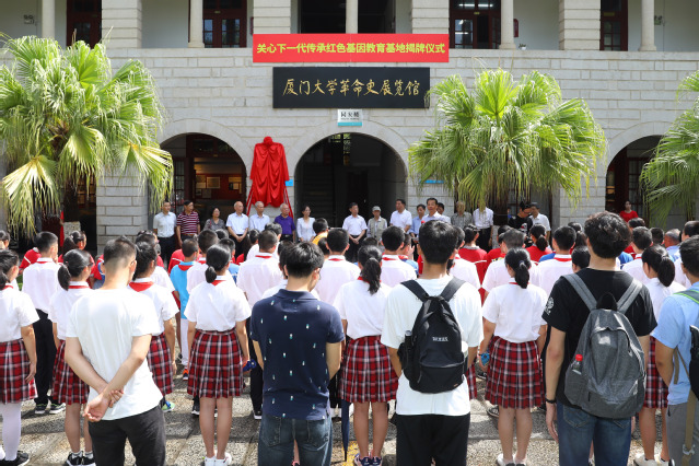 5月27日上午,厦门市关工委与我校关工委在“中共厦门大学支部诞生地暨厦门大学革命史展览馆”联合举行“全省关心下一代传承红色基因教育基地”和“厦门市传承红色基因教育基地”揭牌仪式。厦门市关工委主任陈炳发、第一副主任黄杰成、常务副主任方汉生,副主任毛振亚、韩志刚,我校党委副书记、纪委书记赖虹凯,校关工委主任陈力文,顾问卞守耆,常务副主任黄如彬,副主任颜章炮、郑保东、杨敬达、黄福才出席。厦门市关工委副主任赖菡主持揭牌仪式。陈炳发、黄杰成、赖虹凯、陈力文共同为“关心下一代传承红色基因教育基地”揭牌。参加活动的还有厦门市关工委,各区教育系统、民政系统关工委有关负责同志,我校有关部门负责同志,厦门大学、厦门大学附属科技中学、厦门大学附属演武小学学生代表。