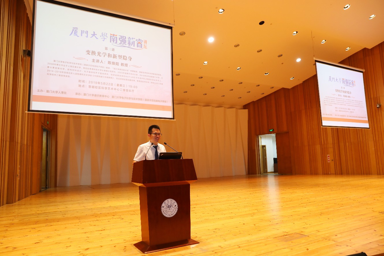 5月22日晚,厦门大学南强新睿讲坛第三讲在思明校区科学艺术中心举行,电子科学与技术学院(国家示范性微电子学院)陈焕阳教授应邀作“变换光学和新型隐身”专题讲座。校党委常委、组织部部长、统战部部长孙理代表学校为陈焕阳教授颁发“南强新睿讲坛”纪念牌。教师工作部、人事处、研究生院、社科处、通识教育中心及电子科学与技术学院等单位负责人出席,电子科学与技术学院(国家示范性微电子学院)副院长(主持工作)陈忠教授主持。