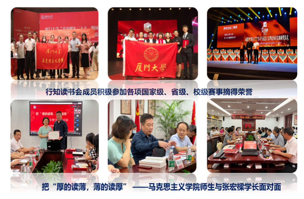 行知读书会(以下简称“读书会”)由厦门大学马克思主义学院团委于2012年发起成立。读书会以“读文献,悟原理,理论联系实际”为宗旨,引导学生全面深刻把握马克思主义理论的精髓,营造全员阅读的浓厚氛围,是学生精读马克思主义理论著作,增进师生学术交流的重要平台。读书会以马克思主义学院硕士生、博士生为主体,累计举办读书活动近70期,邀请吴宣恭、白锡能、苏劲、石红梅、张有奎、张艳涛、原宗丽等数十位老师参与指导,读书会经过十余年发展,现已成为学习制度完善、主题特色鲜明、育人成果丰富的学生培养平台。