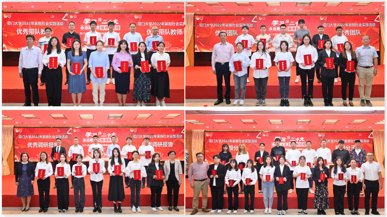 “博学经世”理论社团暑期社会实践队、“八闽之芯”暑期社会实践队、“南强薪火青马之光”暑期社会实践队、“凤凰花”夏令营实践团、“白鹭衔珠”暑期社会实践队、“闽山闽水物华新”暑期社会实践队依次上台分享他们在实践过程中生动感人的事迹、实践成果及心得体会,向大家展示了厦大学子在实践过程中用脚步丈量祖国大地,用青春书写家国情怀。