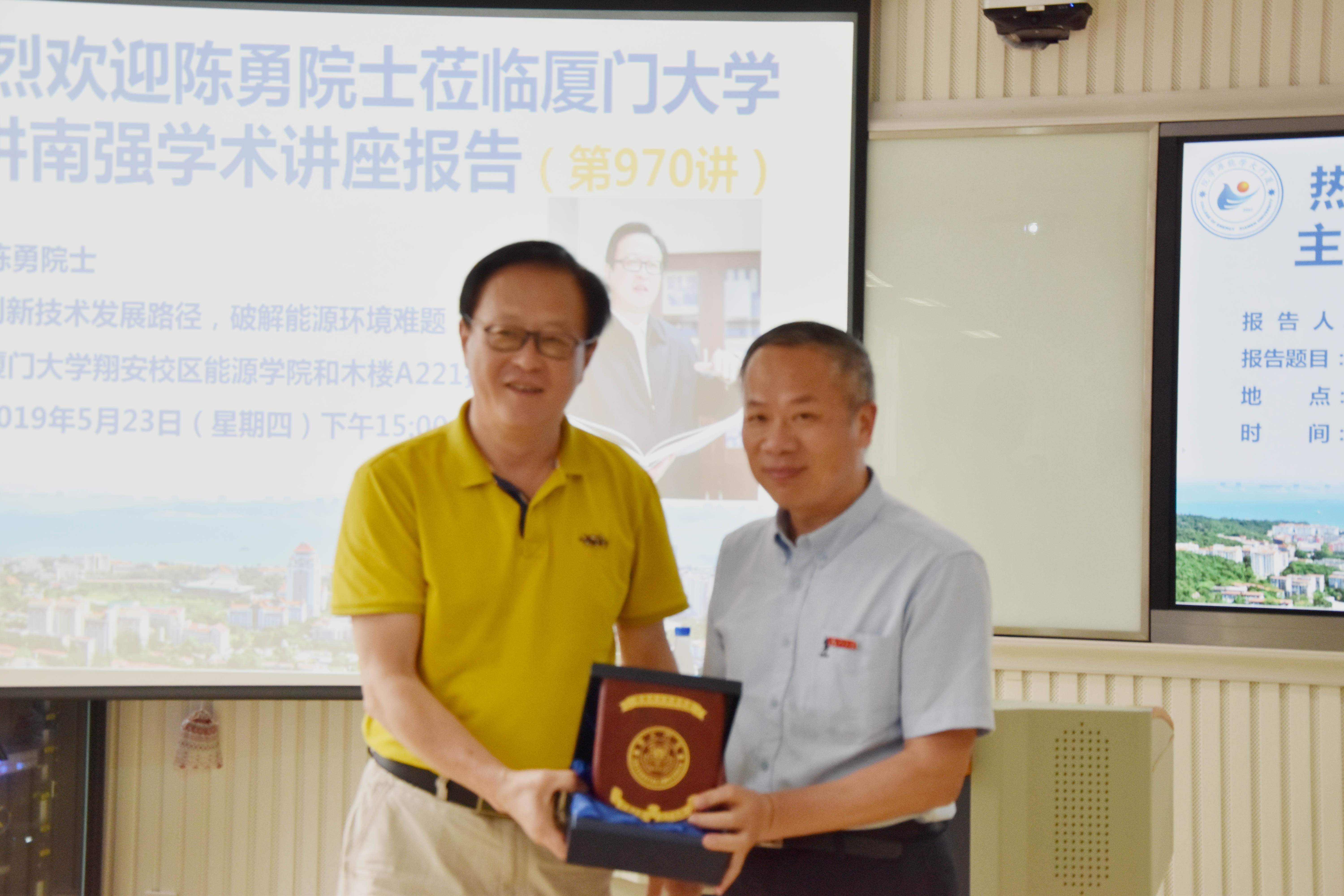 5月23日下午,中国工程院院士、中科院广州能源研究所研究员陈勇应能源学院邀请,做客厦门大学第970期南强学术讲座,在能源学院和木楼A221报告厅做题为《创新技术发展路径,破解能源环境难题》的精彩学术报告。讲座由能源学院党委书记孙梓光主持。校长助理张建霖教授为陈勇颁发了南强学术讲座纪念牌。
