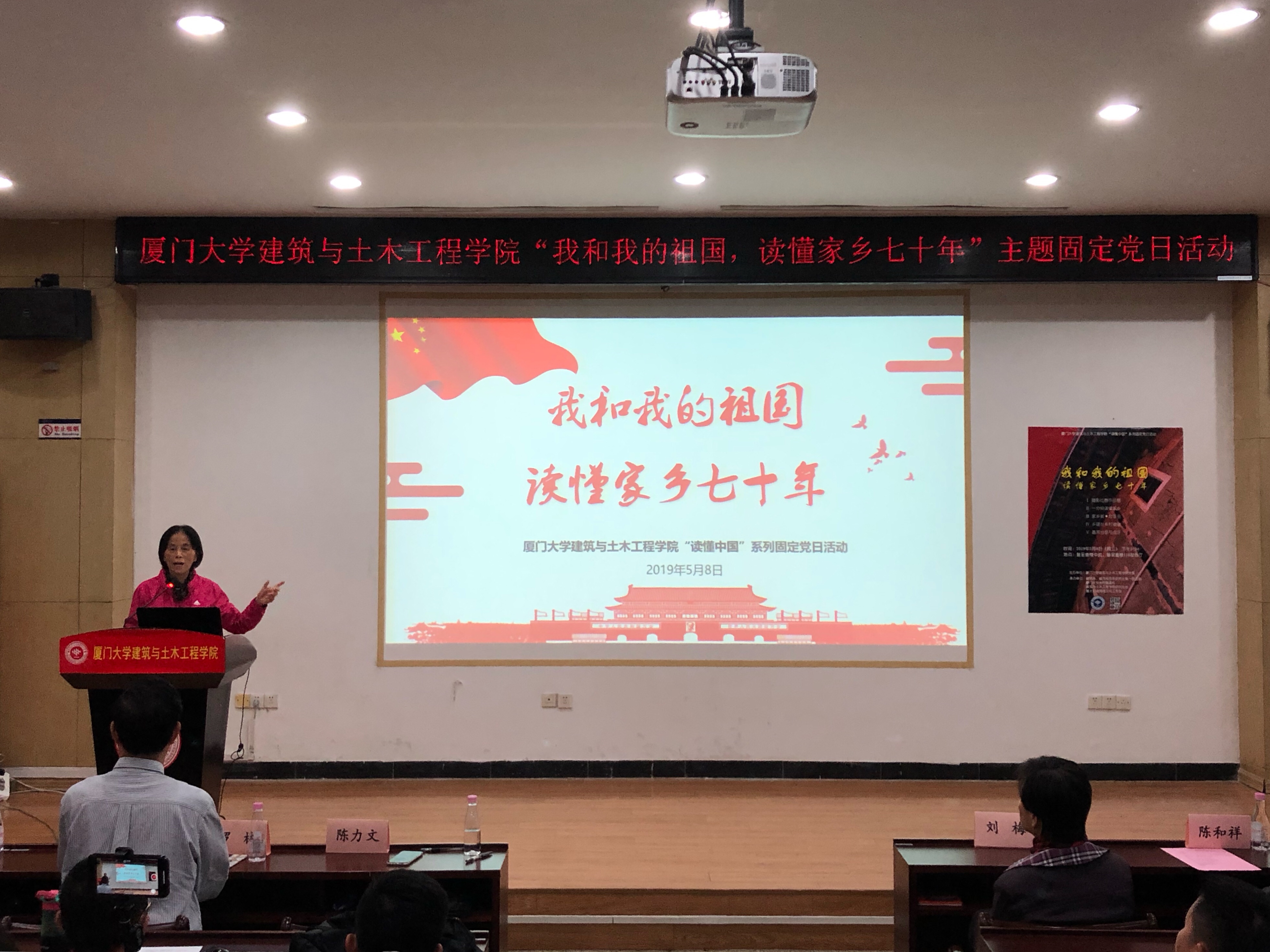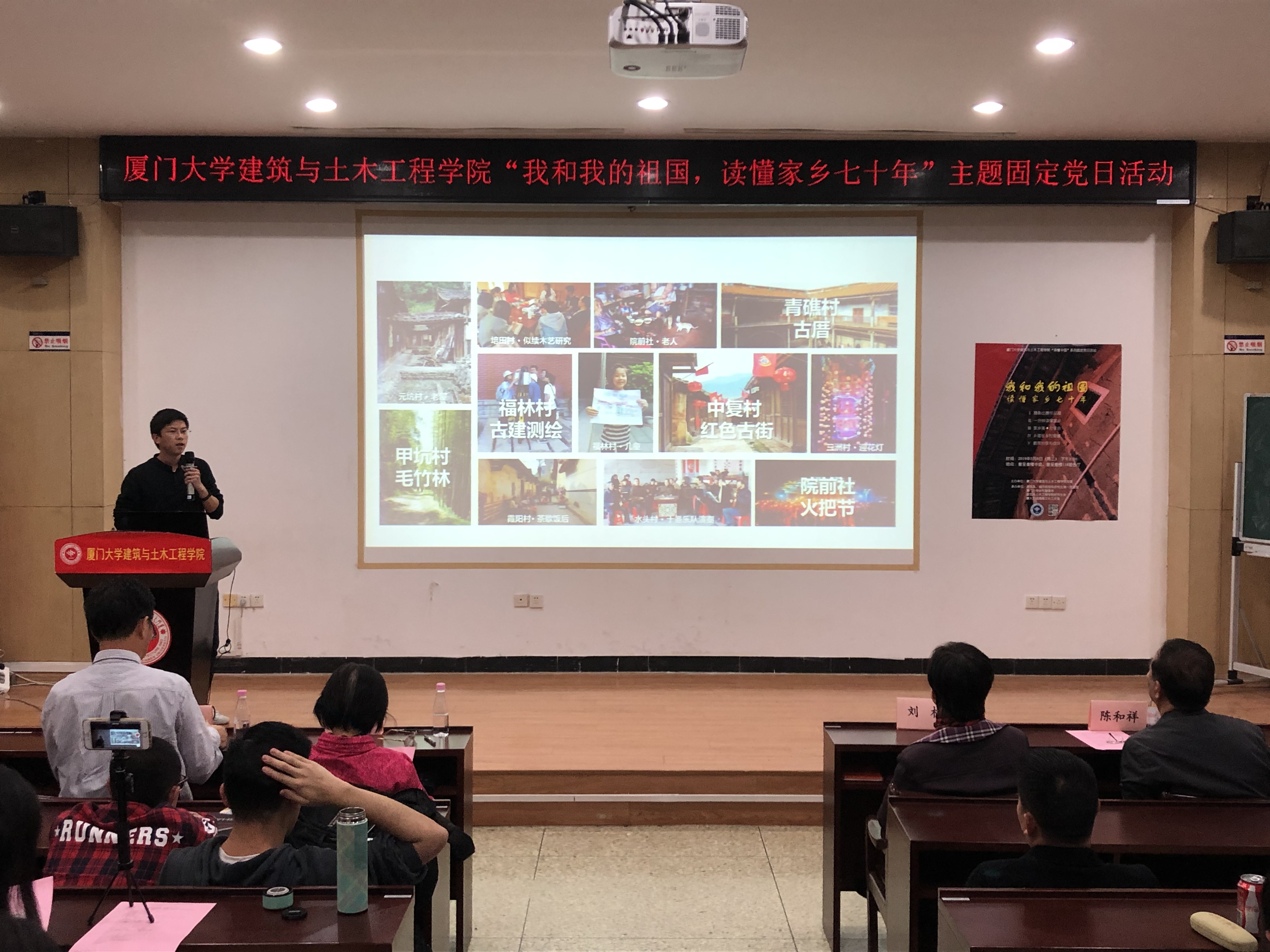 5月8日下午,由建筑与土木工程学院党委主办的“读懂中国”系列固定党日活动之“我和我的祖国,读懂家乡七十年”在曾呈奎楼118报告厅举行。校关工委主任陈力文,建筑与土木工程学院关工委副主任陈和祥,学院党委书记刘梅,党委副书记王瑛慧、黄俊清,建筑系教授罗林,厦大乡建社指导老师李苏豫、学院学工组的全体老师及学院学生党员近一百人参加了本次活动。固定党日活动由学院建筑系、城市规划系研究生第一党支部、厦大乡建社等共同承办。