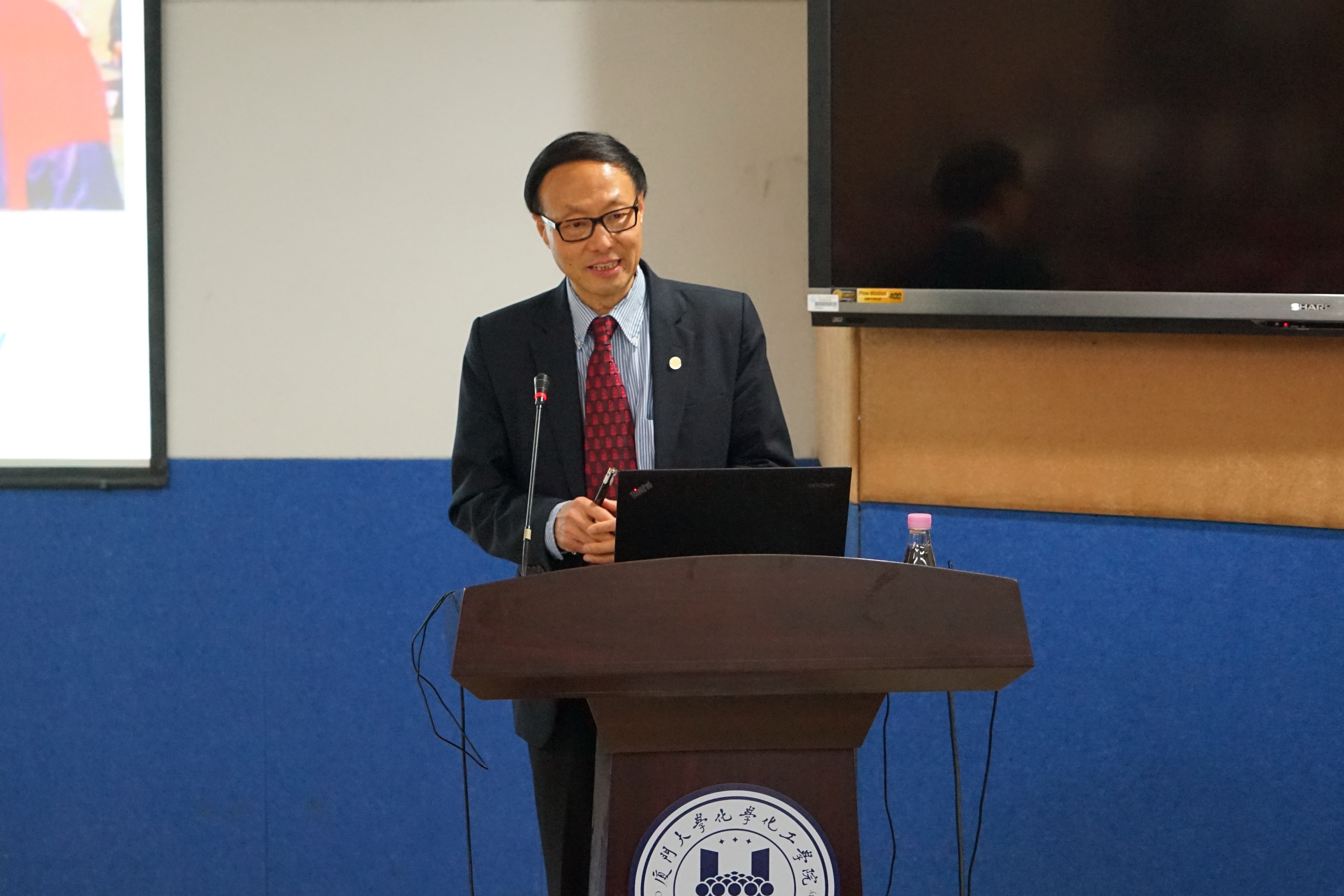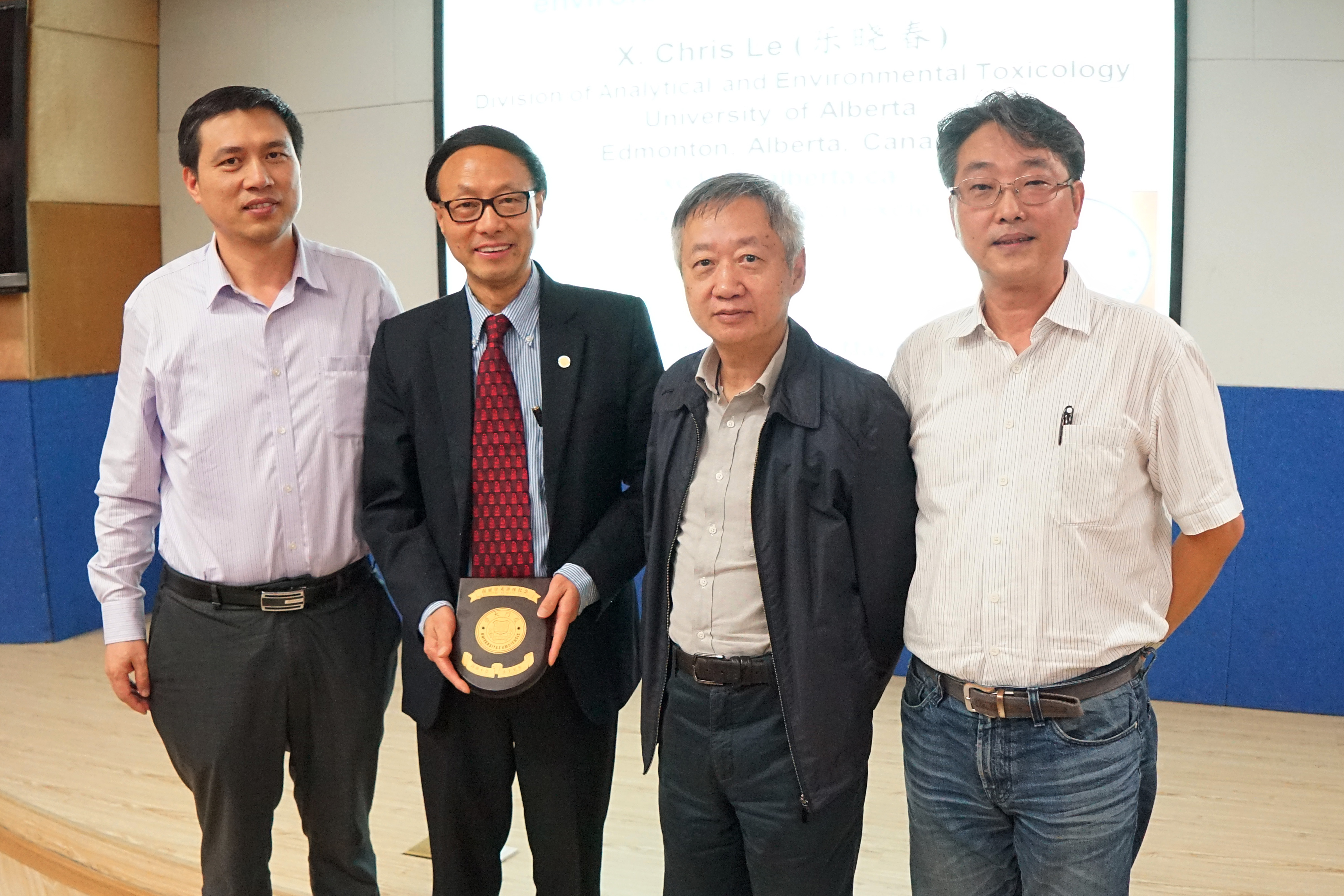 5月6日,应化学化工学院邀请,加拿大皇家科学院院士、阿尔伯塔大学乐晓春教授来访,与学院师生进行学术交流,并应邀做客“南强学术讲座”(第962讲),报告题目为“Bioanlaytical chemistry advancing environmental health research”。讲座由化学化工学院王秋泉教授主持,中科院院士、化学化工学院田中群教授,化学化工学院院长谢兆雄教授为乐晓春教授颁发了“南强学术讲座”荣誉铭牌并合影留念。