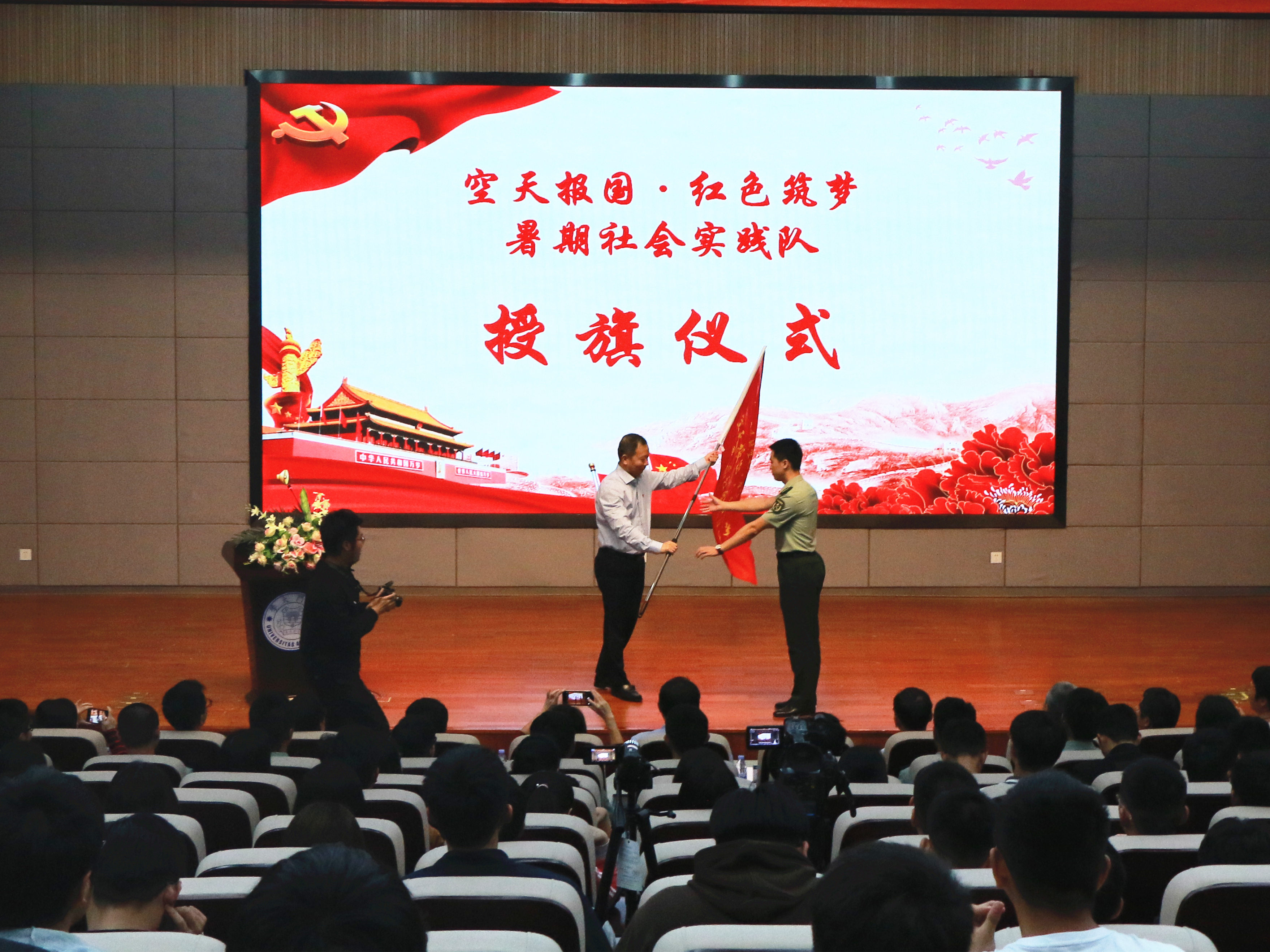 陈光在开班式上为“空天报国•红色筑梦”实践队授旗。