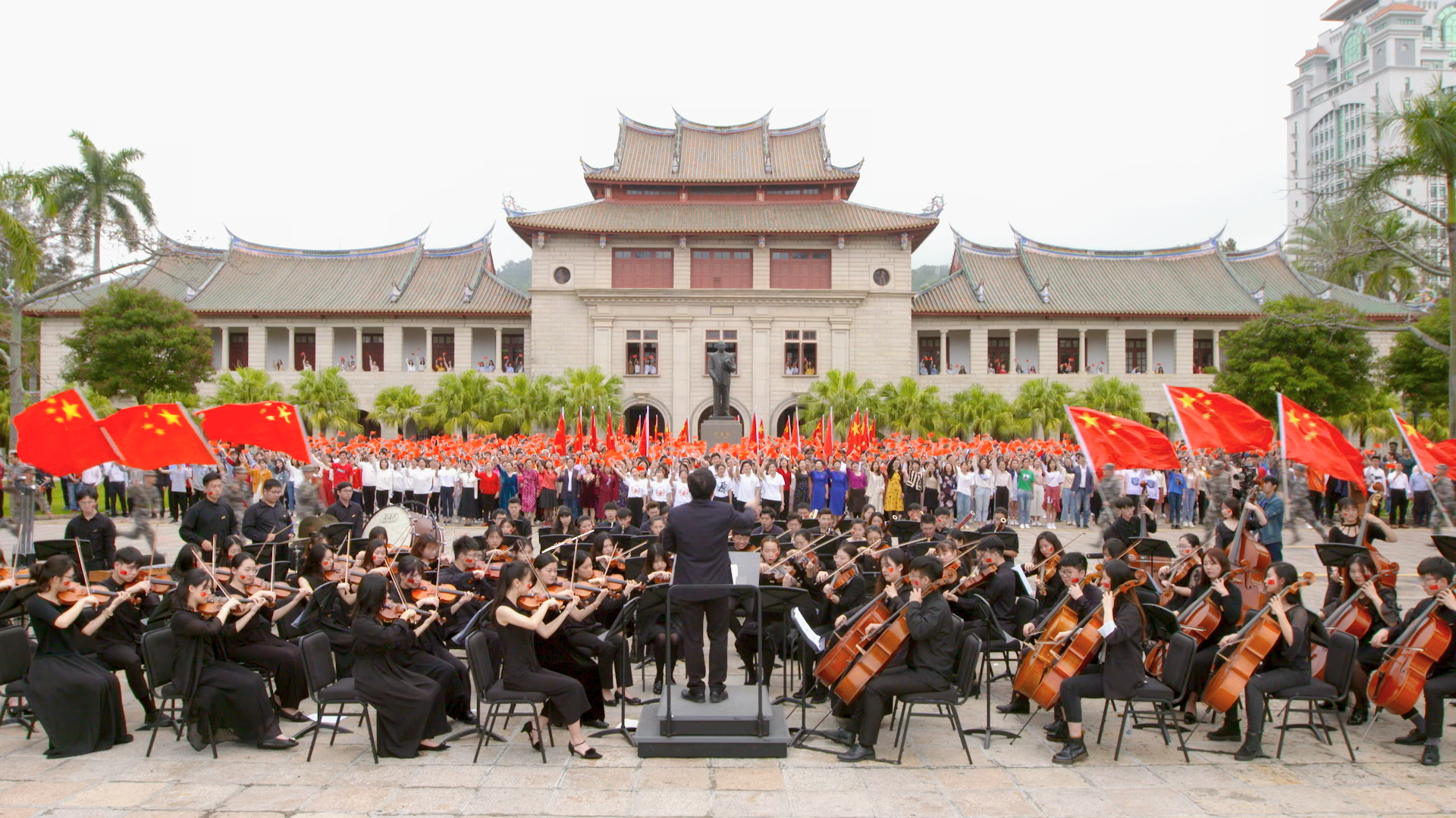 厦门大学是一所与中国共产党同龄的高校,嘉庚精神是厦门大学校园文化的核心内涵,激励着一代又一代的厦大师生爱国、奋进,当日嘉庚铜像前中轴线广场草坛上布置了一面巨幅五星红旗,学生环绕嘉庚铜像站立,面向国旗热情歌唱。我校交响乐团现场演奏,气势恢宏,各民族学生代表跟随音乐翩翩起舞,为活动增添亮丽的色彩。