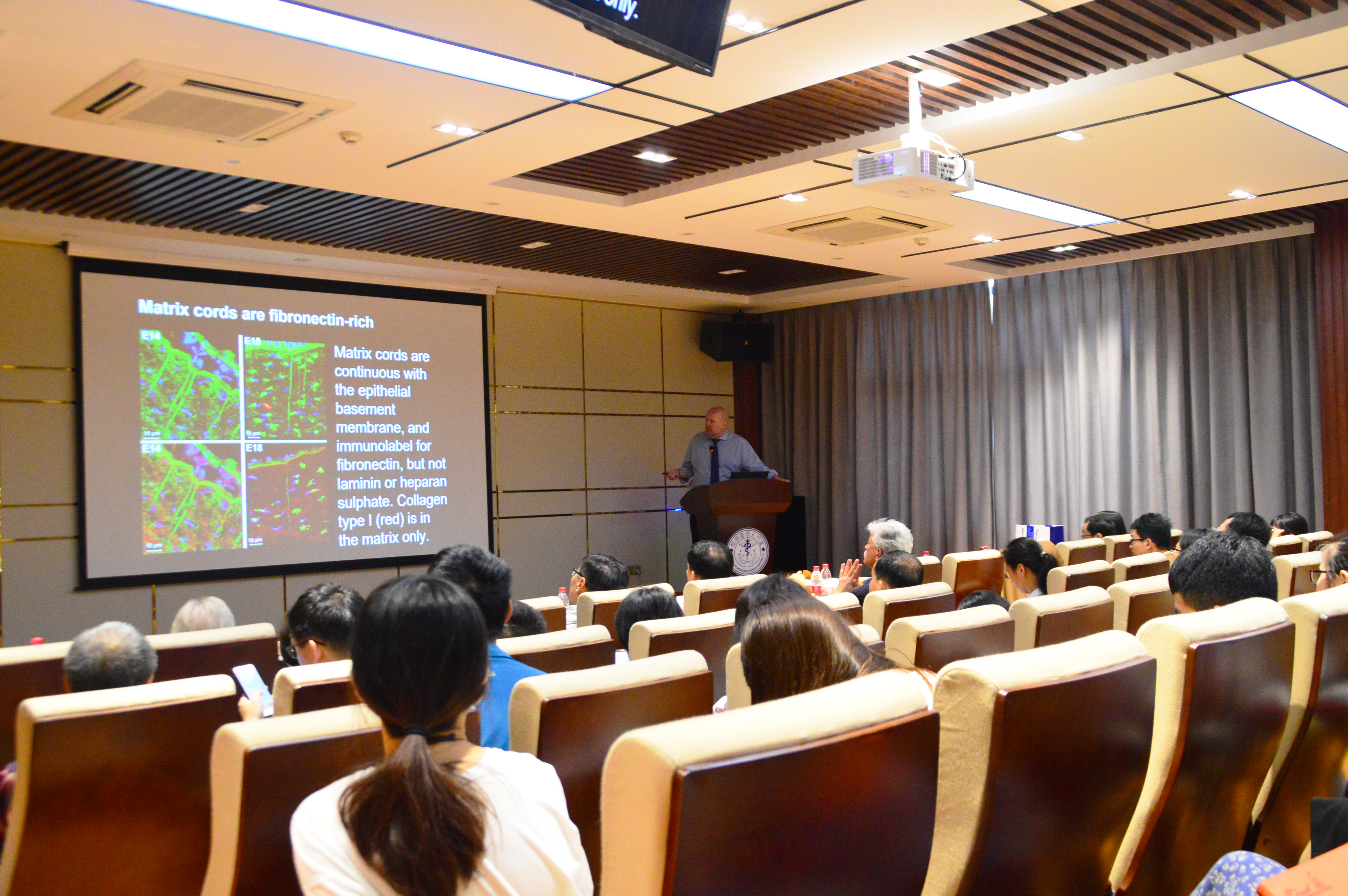 Andrew J. Quantock教授的演讲题目是《Cell-independent extracellular matrix configuration in early corneal development》。角膜基质是一个非常有序的胶原板层叠加阵列,该胶原阵列的排列方式维持了角膜的高度透明性。然而,这种独特结构的沉积机制仍未完全清楚。Quantock教授团队创新性地使用连续块面扫描电镜联合聚焦离子束扫描电镜的方法,对胚胎期小鸡角膜进行3D重建,观察到了早期角膜基质的发育过程和形成顺序。他们发现,胚胎角膜丝状伪足可能代表某些具有独特尺寸以及特异性功能的细胞结构,其在胶原纤维转化为板层结构的过程中起着关键作用,并且对这些结构提出新的术语“keratopodia”。