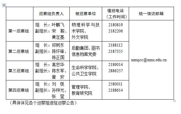 根据《中国共产党章程》《中国共产党巡视工作条例》等中央文件精神及《中共厦门大学委员会巡察工作暂行办法》,经校党委研究决定,中共厦门大学第十一届委员会启动第二轮巡察。本轮巡察共组建了4个巡察组,对物理科学与技术学院、外文学院、后勤集团、图书信息档案党委、生命科学学院、公共卫生学院、管理学院、教育研究院8个基层党组织开展巡察工作,巡察时间1个月左右。日前,四个巡察组已经全部完成进驻。