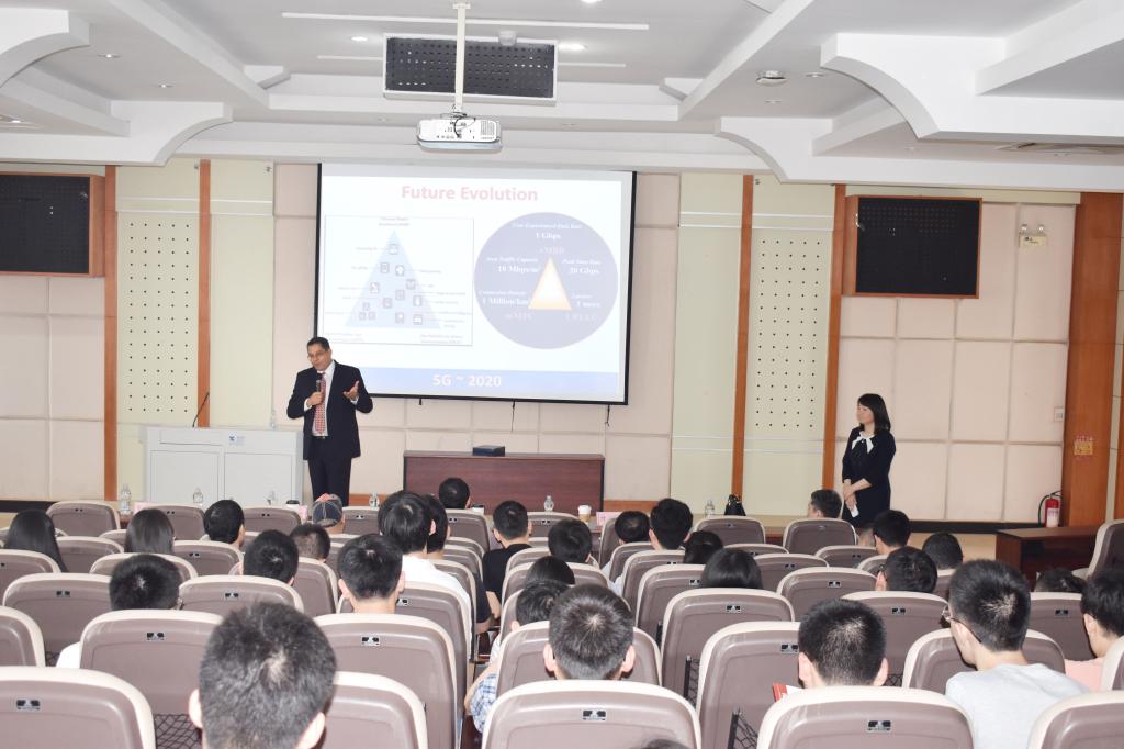 Khaled B. Letaief教授用诙谐幽默的方式开场,介绍了5G的潜在因素、能量效率和可靠性等需求;接着从单位的变化中通俗易懂地解释了使能技术的频谱效率改进方法、网络加密策略和光谱等;并具体介绍了使能技术中的MIMO、Cloud-RAN以及LORA技术;最后他详细地介绍了未来网络的演变史,阐明这是一场从互连的物品到互连的智能的进化历程,其中重点介绍了预计于2020年建成的5G和预计2030年建成的6G。在问答环节,老师和同学们针对报告中一些问题进行了提问,Khaled B. Letaief教授积极应答,讲座现场气氛热烈。