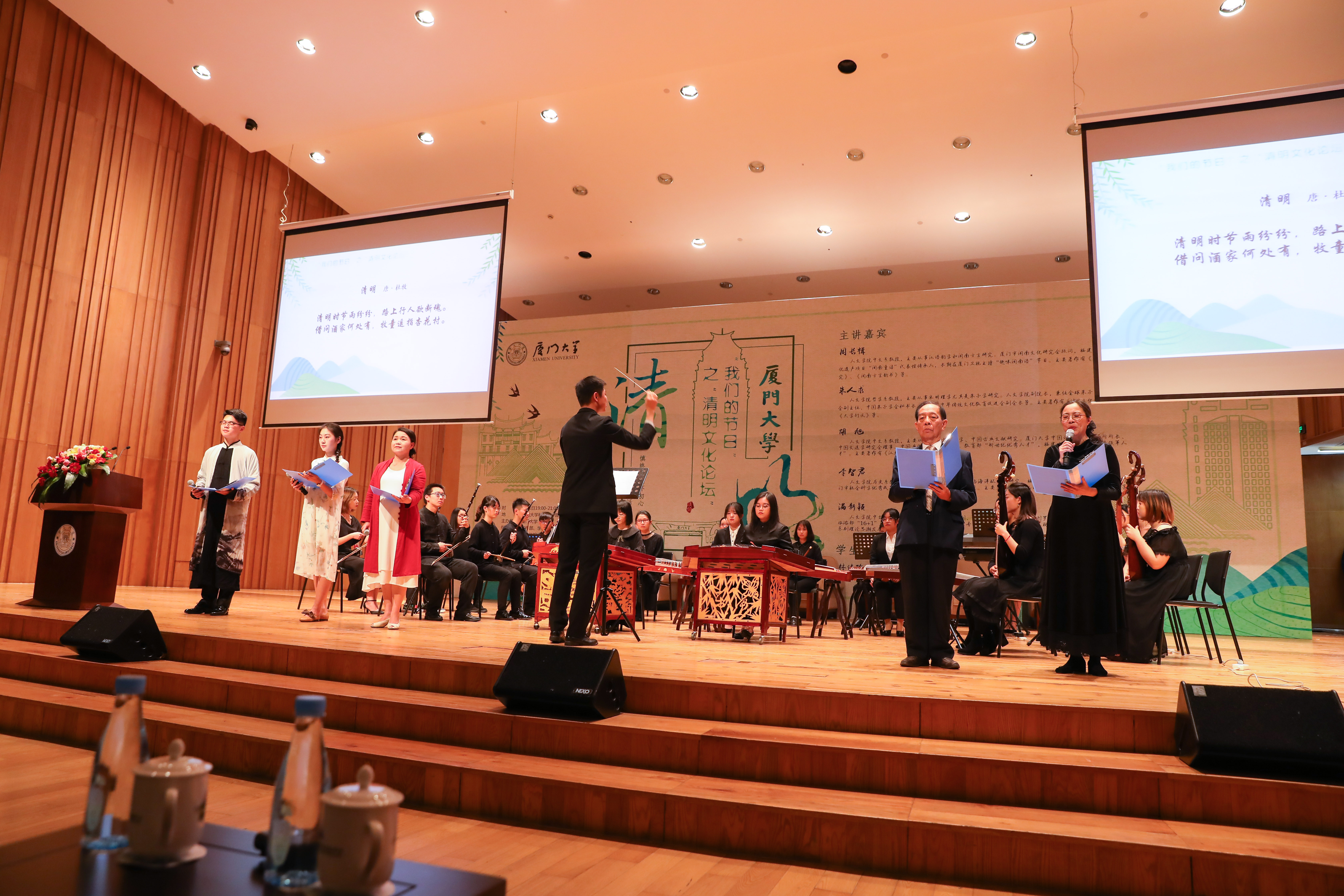 伴随着清丽悠扬的厦大学生民乐团的演奏,本次“清明文化论坛”拉开了序幕。周长楫、杨晓燕、曲晓妮三位老师带领学生分别用普通话和闽南语朗诵了以“清明”和“寒食”为主题的四首清明诗歌,将现场的观众瞬间带入到清明的氛围当中。