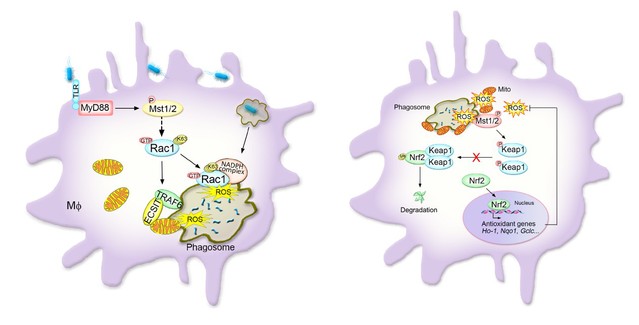 该课题组机制研究发现激酶Mst1/2可以感受ROS并募集到自吞噬体和线粒体的ROS产生部位,被释放的ROS激活,活化的Mst1/2调节抗氧化转录因子Nrf2来维持胞内氧化还原稳态,在病原体清除期间保护细胞免受大量杀伤性ROS诱导的氧化损伤。Nrf2受到负性调节蛋白Keap1的精确调控,多聚化的Keap1能通过C端Kelch结构域锚定Nrf2并促使其走向蛋白酶体依赖性降解,从而抑制其转录活性。本项目研究人员观察到Keap1也能够响应大肠杆菌侵染与Mst1/2在大肠杆菌侵染部位形成三者共定位,而这一现象在使用NAC预处理后明显减少。进一步研究还发现Mst1/2激酶可直接结合Keap1,并对Keap1的四个位点的进行磷酸化修饰,Mst1/2介导的Keap1磷酸化阻止了Keap1分子的多聚化,从而阻断了Nrf2的泛素化和蛋白降解。而当Keap1分子中的四个位点突变为Mst1/2激酶持续失活形态的Keap14A时,更易形成多聚化Keap1,增加了Nrf2的泛素化水平和蛋白不稳定性,从而造成细胞氧化损伤。因此本研究揭示了在巨噬细胞参与宿主防御过程中存在的一条新颖的抗氧化和抗衰老信号,阐明了Mst1/2参与调节巨噬细胞维持氧化应激稳态以实现清除病原体的同时还能避免ROS诱导的自身损伤和细胞衰老的关键机制,为进一步研究氧化应激是如何促进衰老相关炎症和感染的发生和发展提供可能的理论基础。