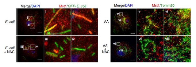 图1.Mst1/2可以感受ROS并募集到自吞噬体(左边)和线粒体(右边)的ROS产生部位,被释放的ROS激活