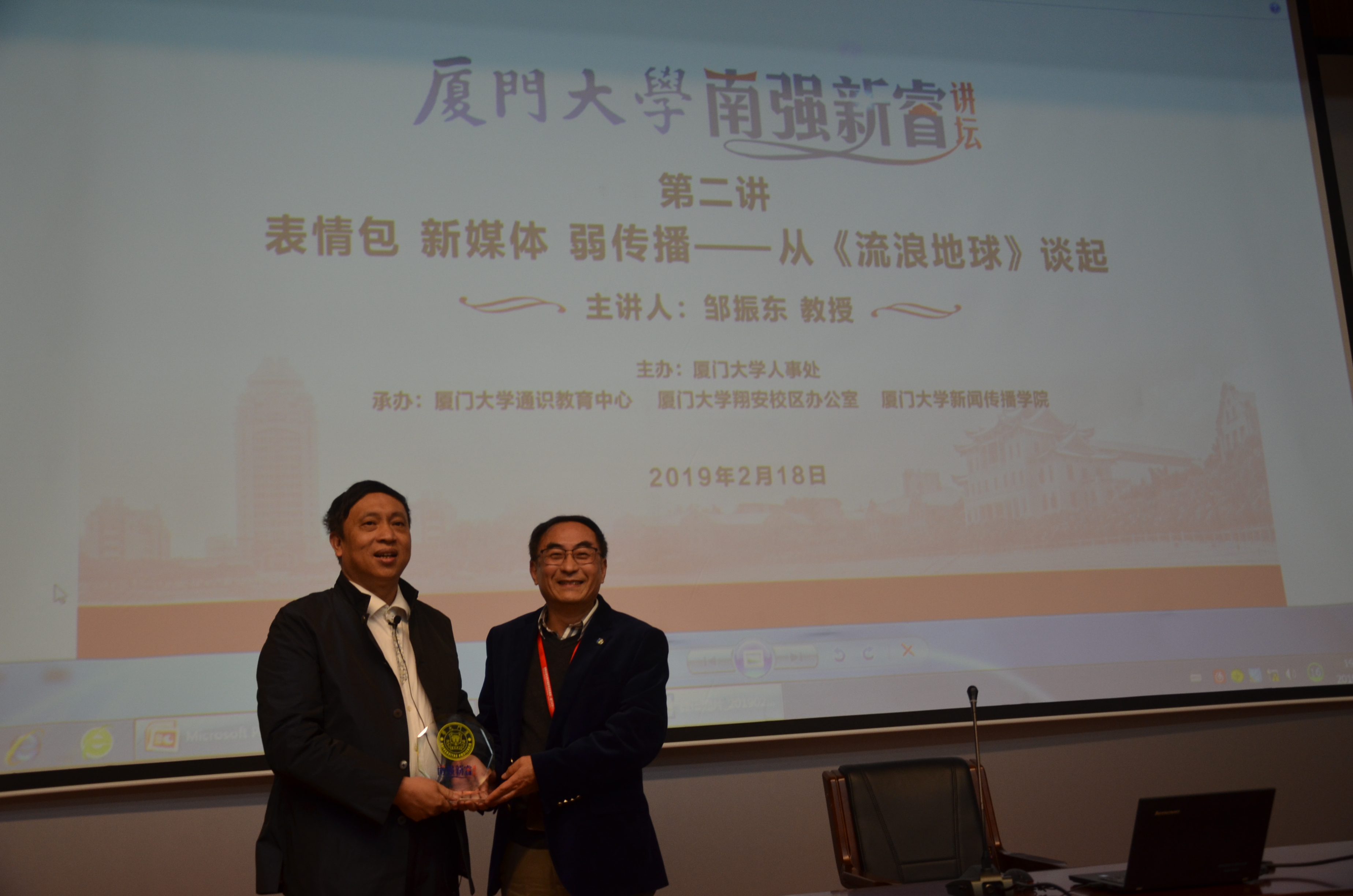 讲坛首先举行了简短的授牌仪式。我校副校长、通识教育中心主任韩家淮教授为邹振东教授颁授“南强新睿讲坛”纪念牌;学生处处长、翔安校区党工委副书记、管委会副主任李峰代表主办承办单位接受邹振东教授手模牌留念。仪式由人事处处长吴立武主持。人事处、通识教育中心、翔安校区办公室、新闻传播学院等主办承办单位负责人出席。