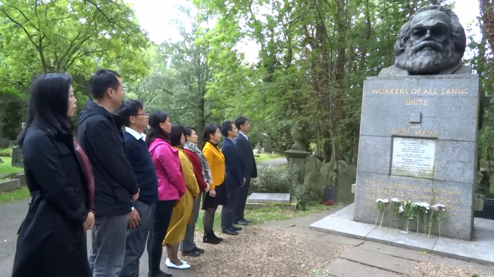 伦敦海格特公墓马克思墓碑前,研修团临时党支部党员向伟人敬献鲜花。
