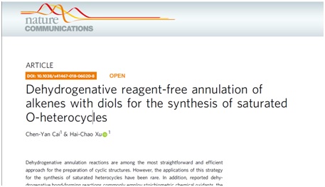 化学化工学院徐海超教授课题组在有机电合成研究方面取得重要进展,相关成果以“Dehydrogenative reagent-free annulation of alkenes with diols for the synthesis of saturated O-heterocycles”为题在线发表于《自然•通讯》(Nature Communications, 2018, 9, 3551)。