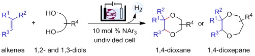 本论文在前期研究的基础上,结合电氧化和溶液相氧化还原催化将烯烃转化为合成上有用的自由基正离子,为拓展该类活性中间体在有机合成中的应用提供了工具。脱氢环化反应是构建环状有机化合物的一种最为直接和高效的方法之一,但是将该方法用于饱和杂环化合物合成的研究依然较为少见,特别是饱和氧杂环仍缺少高效的合成方法。本工作利用烯烃自由基正离子作为中间体实现了简单烯烃和二醇类化合物的电氧化脱氢环化反应,该反应具有很好的官能团兼容性,能够利用简单易得的原料制取各种1,4-dioxane和1,4-dioxepane。