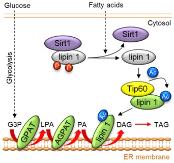 林圣彩教授团队对乙酰转移酶TIP60的研究始于GSK3-TIP60-ULK信号轴在生长因子缺乏的情况下能诱导细胞自噬发生的发现(Science, 2012)。该发现入选了“2012年度中国科学十大进展”。在《Science》的工作中,该团队发现TIP60的86位丝氨酸位点的磷酸化修饰是细胞代谢调控的一个关键事件。因此,他们在这项工作之后立即构建了该位点的基因突变的基因敲入小鼠。该团队发现,表达TIP60的活性下降的该突变体的敲入小鼠能显著抵御肥胖,而且带有该突变的雌鼠也因为乳汁中脂肪含量下降而无法哺育幼崽。肥胖的特征之一是脂肪组织中过量的脂肪酸通过脂肪合成途径被转变成甘油三酯(脂肪)。而lipin 1就是脂肪组织中脂肪合成途径的代谢酶之一。通过深入研究,该团队发现,脂肪酸能促使乙酰转移酶TIP60乙酰化lipin 1,并增强其lipin 1向内质网转运。而内质网则是脂肪合成途径的其他代谢酶的聚集场所,因此,该过程导致脂肪合成速率增强。接着,该团队进一步揭示了去乙酰化酶Sirt1起到拮抗TIP60、抑制lipin 1乙酰化修饰并抑制脂肪合成的作用。此外,该团队通过对酿酒酵母的研究,也证实了上述TIP60对脂肪合成的调控作用在进化上是保守的。