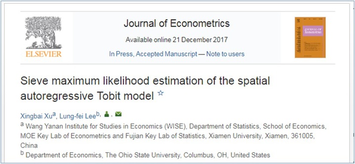 近日,厦大经济学科青年教师许杏柏与美国俄亥俄州立大学经济学讲席教授李龙飞合作撰写的论文“Sieve Maximum Likelihood Estimation of the Spatial Autoregressive Tobit Model”,在线发表于计量经济学国际顶级学术期刊Journal of Econometrics上,即将正式刊出。