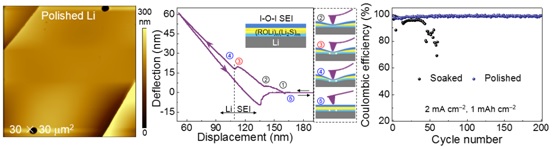 金属锂是下一代高能量密度二次电池最理想的负极材料之一。在以金属锂作为负极的电池中,锂电沉积过程中枝晶的生长及溶解过程的死锂现象是制约电池库仑效率、稳定性和安全性的重要因素,而金属锂表面的微观平整性及固态电解质界面(SEI)膜的组成和结构及由其所决定的电学和力学性质对锂电沉积和溶解行为有重要影响。