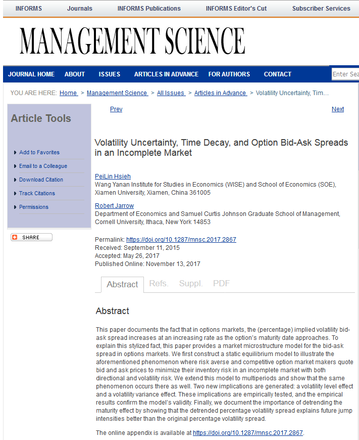 近日,我校王亚南经济研究院(WISE)与经济学院金融系青年教师谢沛霖作为第一作者及通讯作者,与美国康奈尔大学金融学教授Robert Jarrow合作撰写的论文“Volatility Uncertainty, Time Decay, and Option Bid-Ask Spreads in an Incomplete Market”正式在线发表在国际公认的管理科学领域的顶级期刊Management Science。