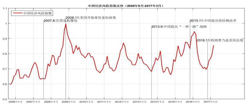 2005年9月以来,中国经济风险指数经历了2次显著上升时期,分别是:(1)2007年8月,次贷危机爆发后,中国经济风险指数大幅上升,达到历史最高水平;(2)从2014年初到2016年,中国经济风险指数也有显著上升。在2016年,中国经济风险指数逐渐下降,但从2016年10-11月开始,中国经济风险指数又开始上升,建议密切关注2017年以来中国宏观经济运行情况。