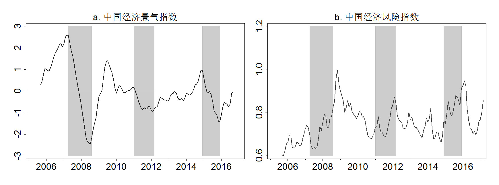 我们将中国经济风险指数和宏观经济景气指数做了一个比较,如图2所示。2005年9月以来,中国宏观经济景气指数有三个较为明显的下行阶段,分别是:2007年4月-2008年8月、2010年4月-2012年3月、2014年12月-2015年12月(图2中阴影标注的三个阶段)。我们发现在这三个阶段经济风险指数均处于上升趋势: