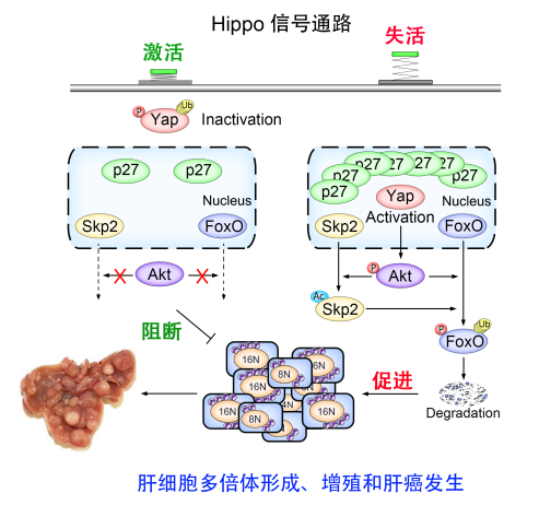 深入研究发现, Hippo信号通路下游效应分子YAP通过AKT-SKP2信号促进二倍体细胞向多倍体转化及多倍体细胞的生长增殖。YAP可以强烈诱导乙酰转移酶P300对E3泛素连接酶SKP2的乙酰化,后者的乙酰化形式在细胞质中定位,造成其核内底物周期蛋白依赖性激酶抑制蛋白P27在核内大量累积,导致细胞有丝分裂阻滞并成为多倍体。另一方面,胞质中的SKP2大量降解促凋亡因子FoxO1/3,使多倍体细胞持续分裂,基因组不稳定,最终导致肿瘤发生。对人类肝癌样品的分析验证了以上结论,YAP的激活与SKP2乙酰化增强及FoxO1的下调有显著的相关性,并且YAP的入核与SKP2的出核也同时与肿瘤发展程度和不良预后成正相关。