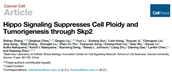 5月8日,细胞信号网络协同创新中心、细胞应激生物学国家重点实验室、厦门大学生命科学学院周大旺教授和陈兰芬教授研究团队在癌症研究领域顶级学术期刊《Cancer Cell》上发表题为“Hippo Signaling Suppresses Cell Ploidy and Tumorigenesis through Skp2”的研究论文。该团队发现了Hippo信号通路在限制肝脏细胞的染色体由两倍体向多倍/非整倍体转变过程中起关键作用,该机制异常将导致基因组不稳定继而诱发肝癌的发生发展。