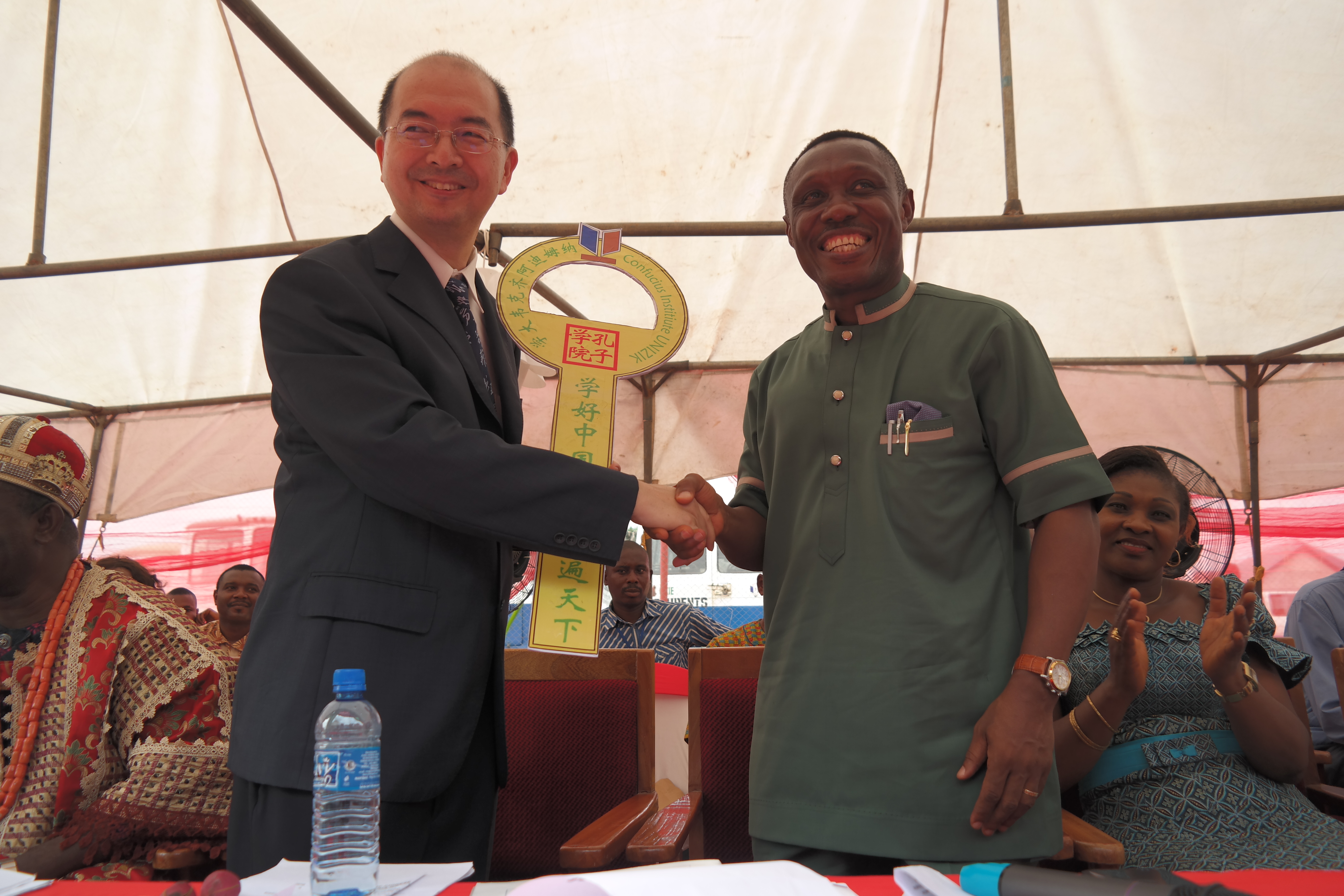 6月28日,纳姆迪·阿齐克韦大学(简称UNIZIK)孔子学院“尼日利亚中华文化研究中心”揭牌仪式在孔院门前的广场上举行。按照尼日利亚当地习俗,广场上搭起五颜六色的帐篷、拱门、舞台,会场上彩旗飘舞,鲜红的五星红旗悬挂在舞台一侧。