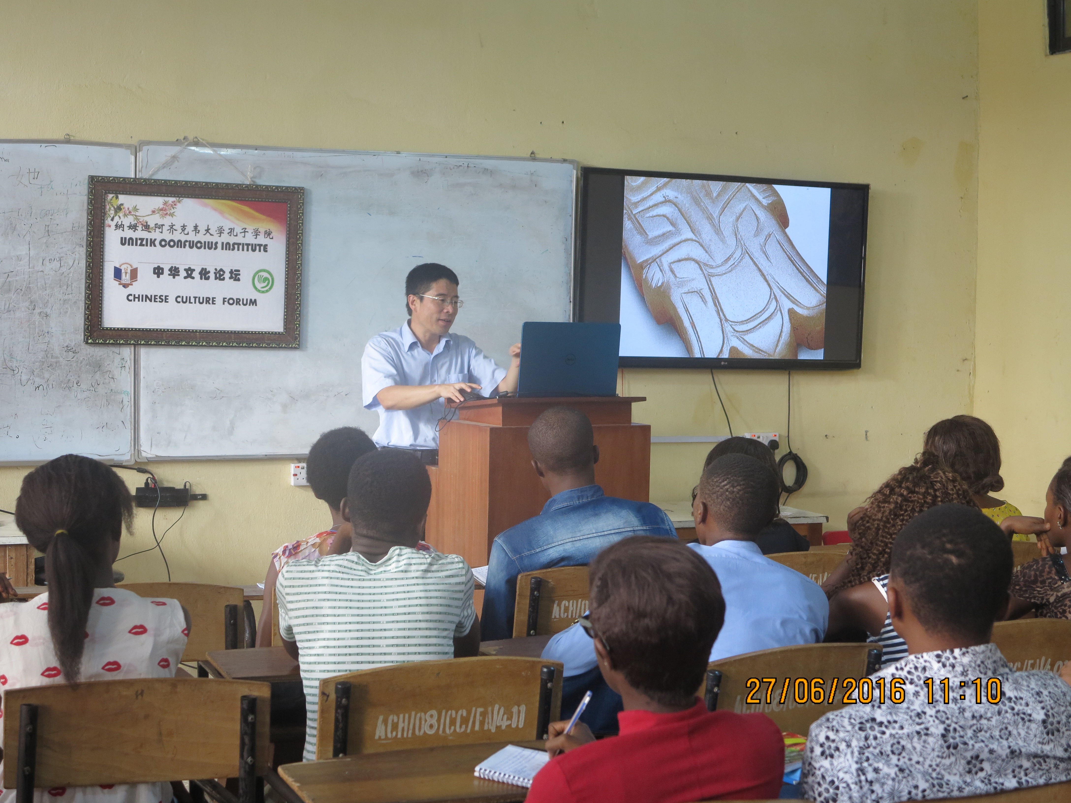 配合揭牌仪式,UNIZIK孔院还特别邀请阿布贾中国文化中心的尤宝铭研究员为孔院师生开设题为“丝绸之路与中华文明”的学术讲座。尤宝铭先生长期在甘肃省博物馆工作,是孔院“中华文化论坛”的首位主讲人。他通过大量的图片深入浅出地介绍了丝绸之路的起源、发展历程以及对促进中外交流的历史意义。讲座内容丰富、翔实、生动,听众被精美的图片和精彩的讲演深深地吸引。该讲座对于地处尼日利亚东南部偏远地区、渴望了解中华文化的UNIZIK师生来说显得格外珍贵。