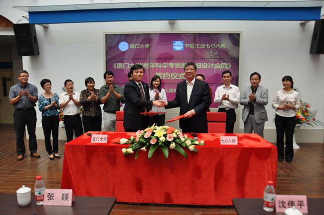 厦门大学重点建设的3000吨级海洋科学考察船详细设计招标工作已圆满结束。11月2日下午,我校张颖副校长代表校方与中国船舶工业集团公司第七○八研究所沈伟平副所长在曾呈奎楼正式签订科学考察船详细设计技术合同,教育部科技司基础处邹晖副处长与学校相关部门、海洋与地球学院及环境与生态学院师生代表见证此次签约。厦门大学海洋科学考察船项目详细设计技术合同的签署,是继今年5月份与美国Glosten公司签订初步设计技术合同之后又一具里程碑式意义的事件,标志着我校海洋科学考察船距船厂招标建造只有一步之遥。