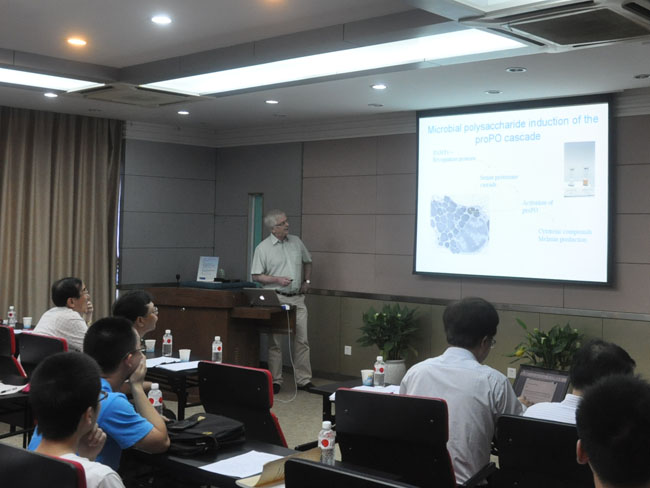 论坛围绕水生动物的免疫学研究,展示了国内外该领域最前沿的研究进展:无脊椎动物是水生动物中很重要的生物,对其免疫系统的深入了解能更好地防治虾蟹等的病害,Kenneth Söderhäll 在论坛上介绍了无脊椎动物的先天免疫系统及其目前所研究的重要免疫相关基因/蛋白的一些进展; 文昌鱼代表了高等动物进化过程中一个重要的过渡阶段,其重要性不言而喻,而Toll样受体信号通路是病原菌感染生物的一个很关键的过程,徐安龙教授对其进行了深入的机制研究,并与大家探讨了基底脊索动物文昌鱼中Toll样受体的信号通路;宋林生研究员课题组对于扇贝的先天性免疫做了大量出色的工作;李奇英教授阐述了甲壳动物神经多肽CHH的功能;王金星教授带来了关于克氏原螯虾prohibitin蛋白与vp28蛋白结合抑制了WSSV的复制的讲座;秦启伟教授则分享了石斑鱼在病毒感染下细胞凋亡及病毒复制的MAPK信号通路的研究。