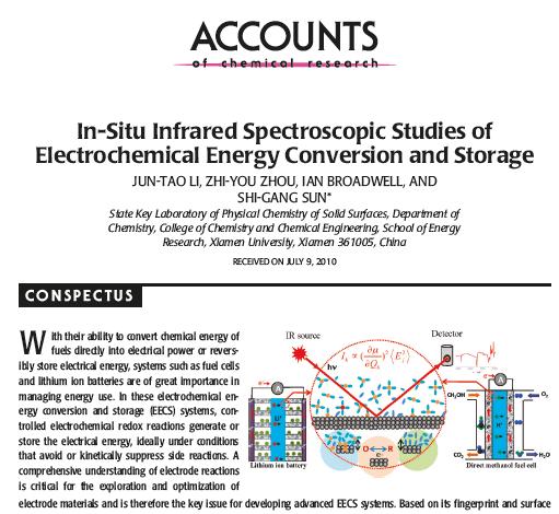 孙世刚教授课题组长期致力于发展电化学原位红外光谱技术并将其应用于电化学能源体系研究;于1990年建立国内第一套电化学原位红外反射光谱系统,创建了居国际先进水平的电化学原位显微红外光谱、步进扫描时间分辨红外光谱和表面组合红外光谱检测方法;并系统深入地研究了碳一分子、碳二至碳四醇分子和氨基酸分子的电化学吸附和电催化反应,阐明其电催化反应机理。于1996年首先报道了纳米材料的异常红外效应,进一步利用异常红外效应显著提高原位红外光谱检测表面物种的灵敏度。孙世刚教授课题组还将原位红外光谱拓展到非水体系,研究锂离子二次电池的界面过程。因此受Accounts of Chemical Research杂志主编Joan Selverstone Valentine教授邀请撰写运用原位红外光谱研究电化学能源体系界面过程的论文。
